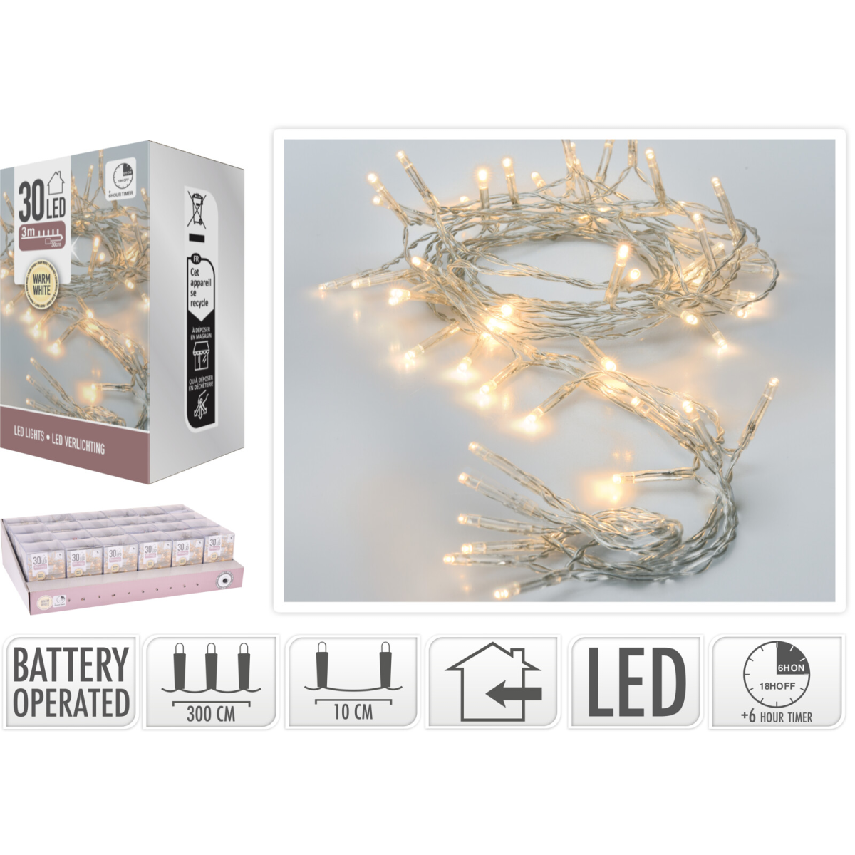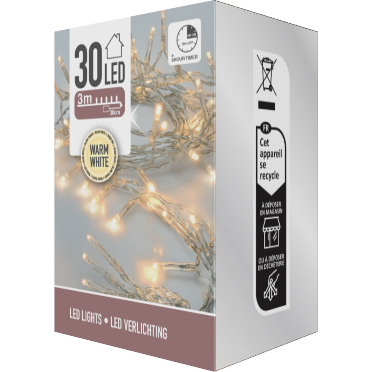 A fényfűzér egy sokoldalúan használható beltéri fénydekoráció, amely 30 darab LED izzót tartalmaz. A meleg fehér fényű izzók meghitt és hangulatos megjelenést biztosítanak, míg a 8 különböző világítási funkció lehetővé teszi, hogy a fényeket különböző ritmusokban és mintázatokban villogtassa. A LED-ek egymástól való távolsága 10cm. A fénysor hossza 3 méter, a kábel hossza 0.3 méter. Időzítő funkcióval ellátott. Elemmel működik (3xAA), melyeket a csomag nem tartalmaz. Ideális beltéri használatra, legyen szó akár ünnepi dekorációról vagy csak hangulatos esti világításról.