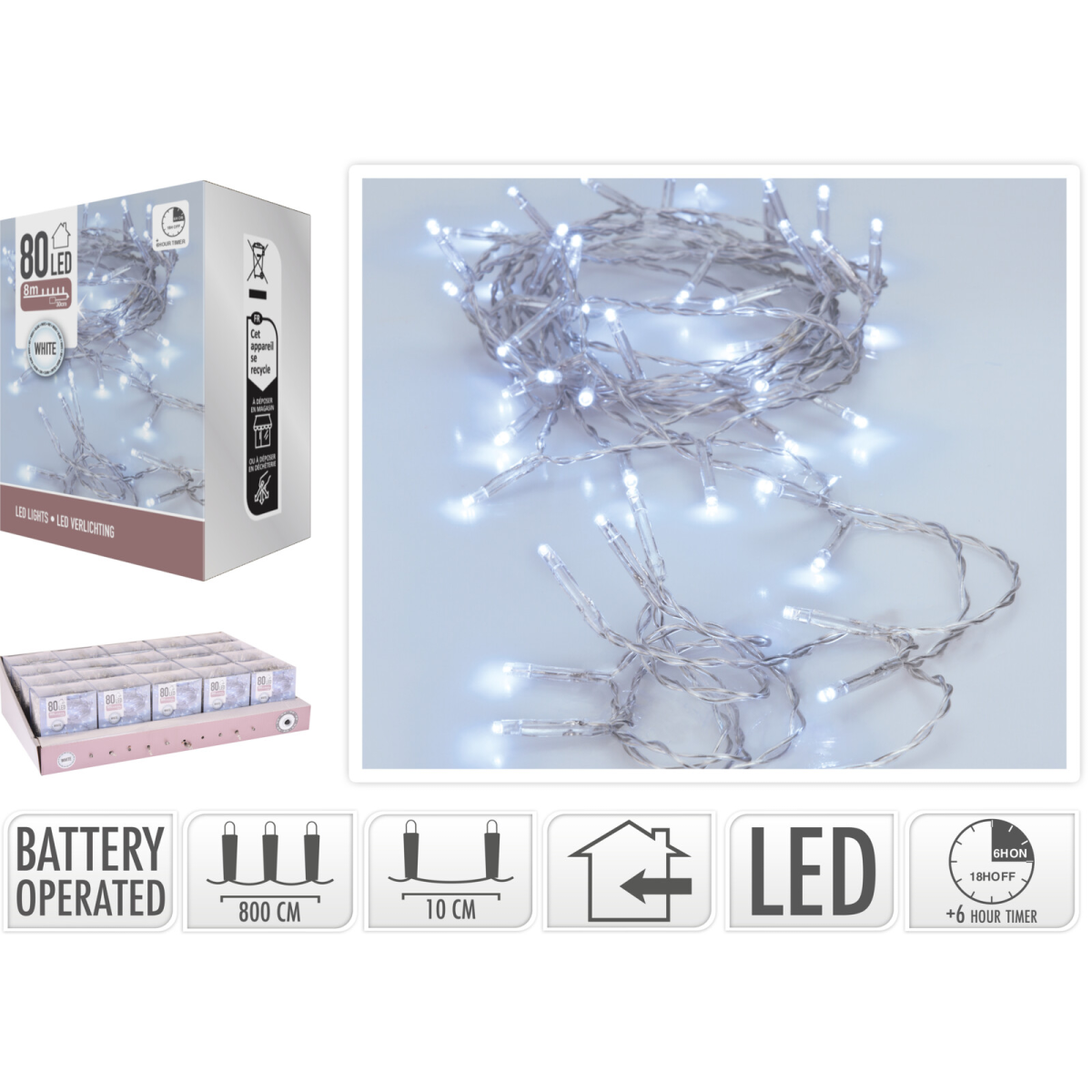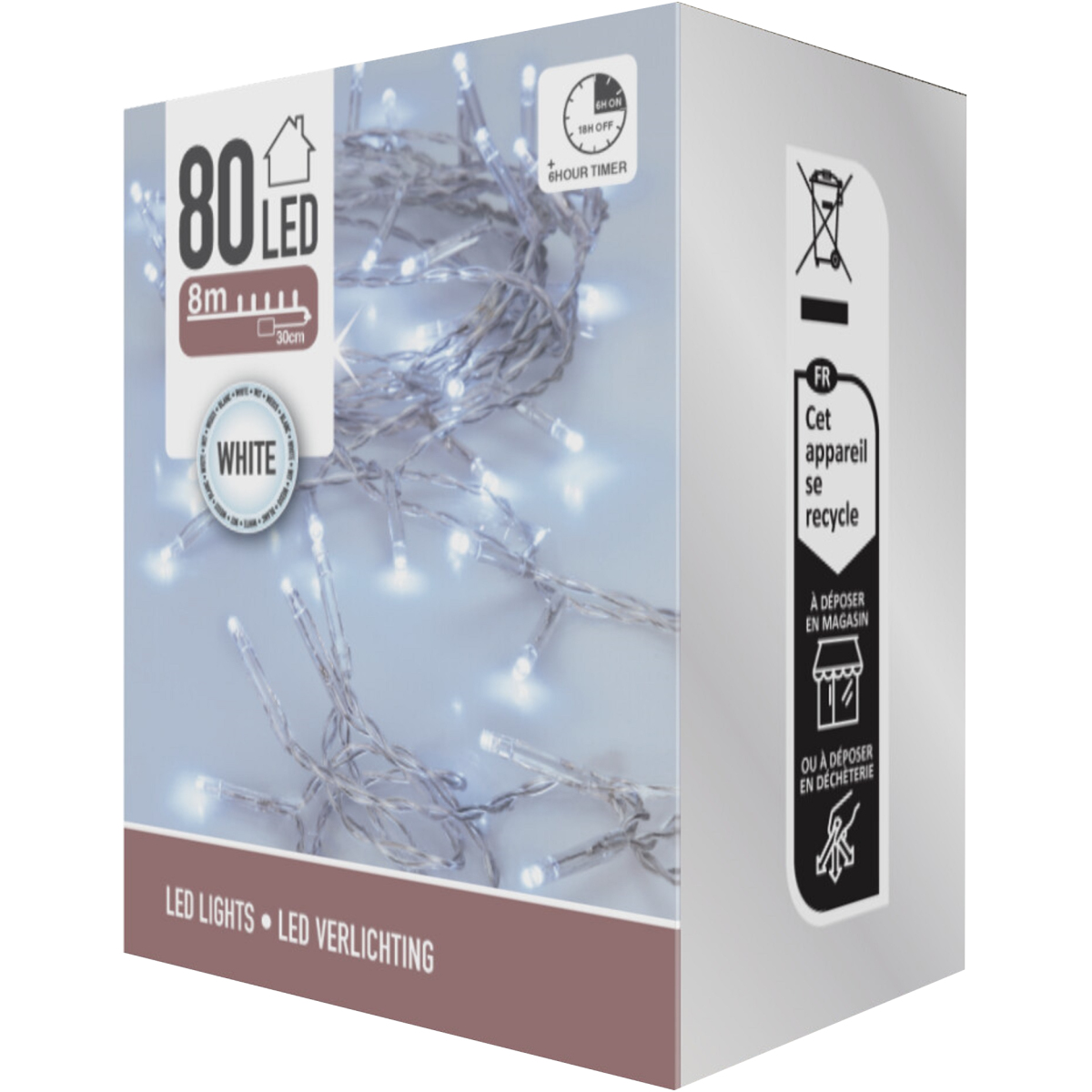A fényfűzér egy sokoldalúan használható beltéri fénydekoráció, amely 80 darab LED izzót tartalmaz. A hideg fehér fényű izzók tiszta és modern megjelenést biztosítanak, míg a 8 különböző világítási funkció lehetővé teszi, hogy a fényeket különböző ritmusokban és mintázatokban villogtassa. A LED-ek egymástól való távolsága 10cm. A fénysor hossza 8 méter, a kábel hossza 0.3 méter. Időzítő funkcióval ellátott. Elemmel működik (3xAA), melyeket a csomag nem tartalmaz. Ideális beltéri használatra, legyen szó akár ünnepi dekorációról vagy csak hangulatos esti világításról.