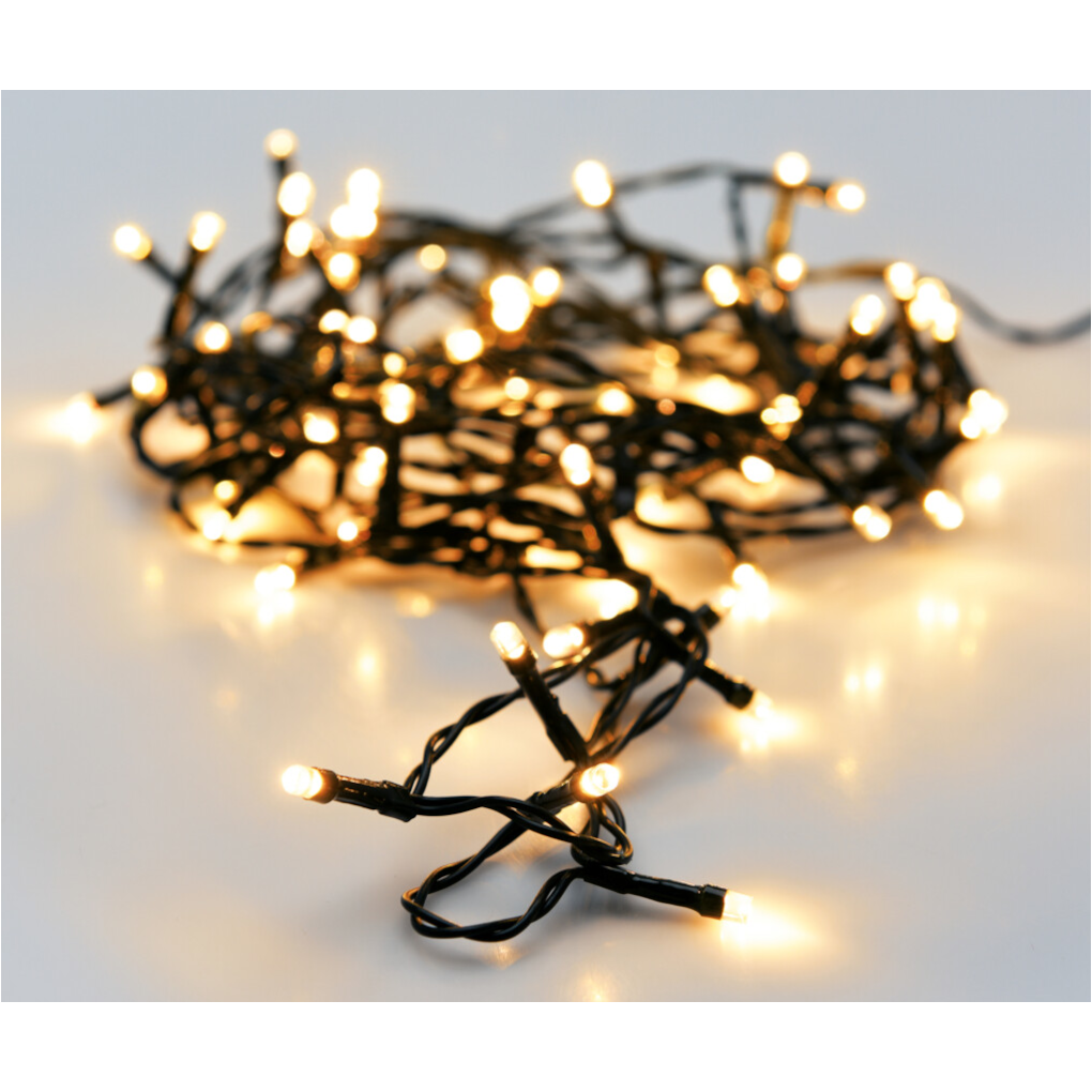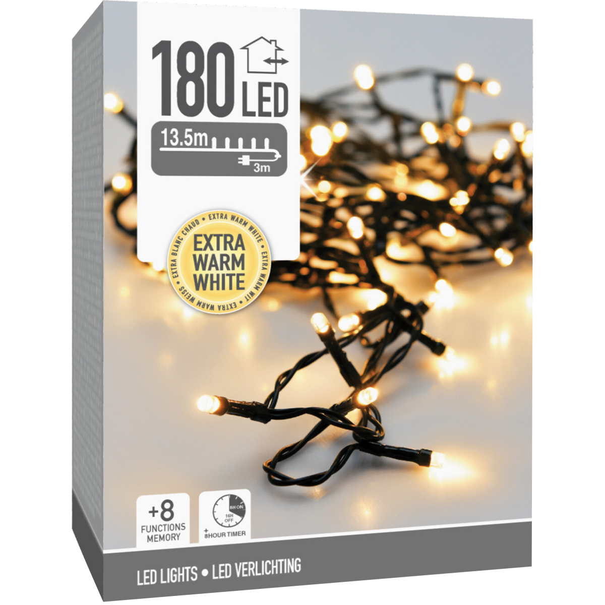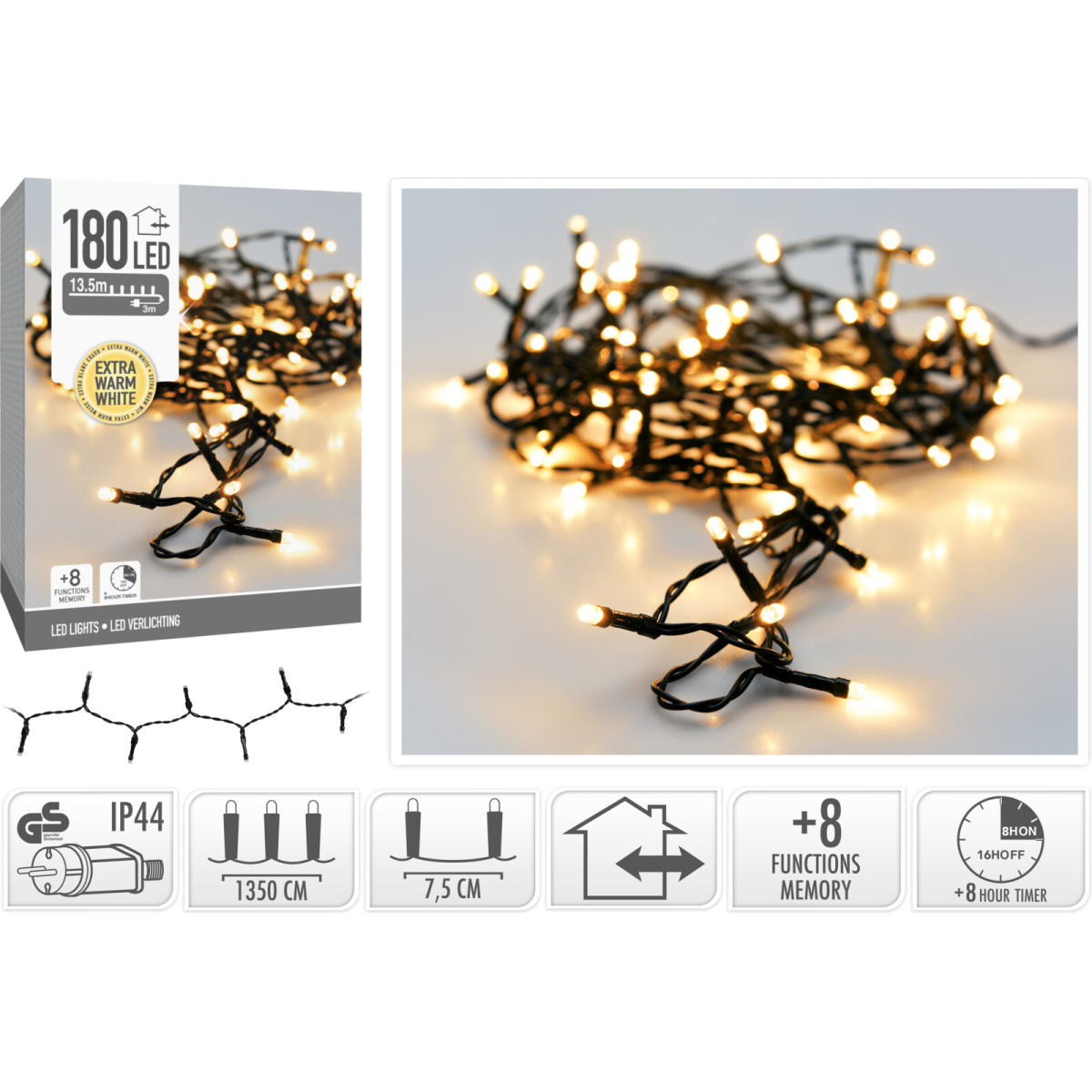 A fényfűzér egy sokoldalúan használható kültéri fénydekoráció, amely 180 darab LED izzót tartalmaz. Az extra meleg fehér fényű izzók meghitt és hangulatos megjelenést biztosítanak, míg a 8 különböző világítási funkció lehetővé teszi, hogy a fényeket különböző ritmusokban és mintázatokban villogtassa. A LED-ek egymástól való távolsága 7.5cm. A fénysor hossza 13.5 méter, a hálózati kábel hossza 3 méter. Memóriával és időzítő funkcióval ellátott. Ideális kültéri használatra, legyen szó akár kerti partikról, ünnepi dekorációról vagy csak hangulatos esti világításról.