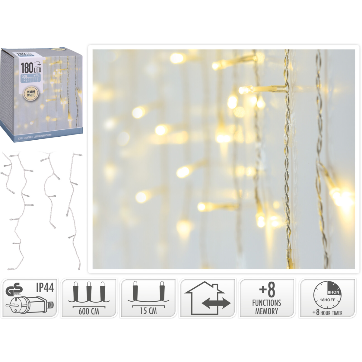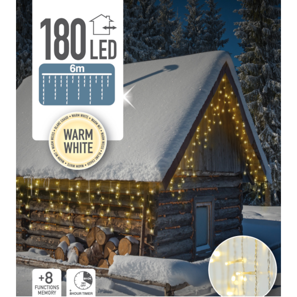 A fényfűzér egy sokoldalúan használható kültéri fénydekoráció, amely 180 darab LED izzót tartalmaz. Az meleg fehér fényű izzók meghitt és hangulatos megjelenést biztosítanak, míg a 8 különböző világítási funkció lehetővé teszi, hogy a fényeket különböző ritmusokban és mintázatokban villogtassa. A LED-ek egymástól való távolsága 15cm. A fénysor hossza 6 méter, a hálózati kábel hossza 3 méter. A kábel átlátszó színű. Memóriával és időzítő funkcióval ellátott. Ideális kültéri használatra, legyen szó akár kerti partikról, ünnepi dekorációról vagy csak hangulatos esti világításról.