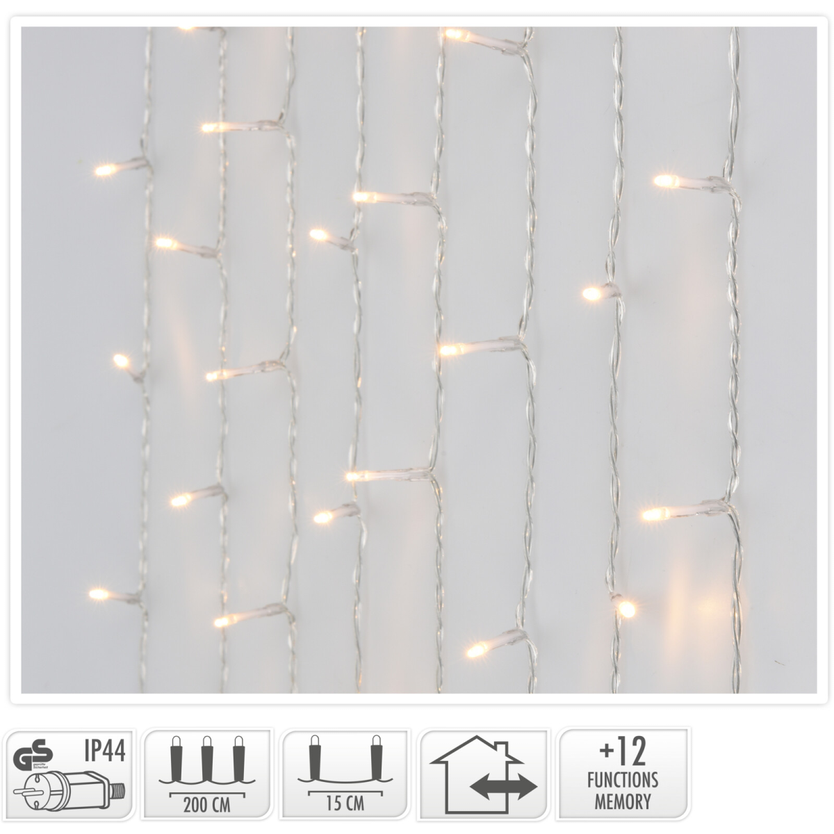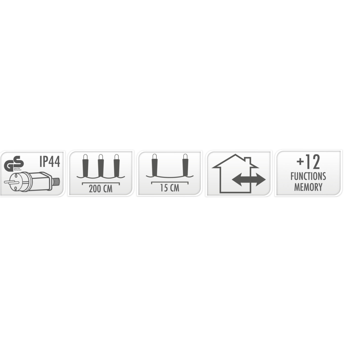 A fényfüzér egy sokoldalúan használható kültéri fénydekoráció, amely 240 darab LED izzót tartalmaz. A meleg fehér fényű izzók meghitt és hangulatos megjelenést biztosítanak. A hálózati kábel hossza 5 méter, átlátszó színű. 12 funkciós memóriával rendelkezik. 16 db szálból áll, minden szál 15 db LED-et tartalmaz, szálak távolsága 15 cm. 8/16 órás időzítővel rendelkezik. Ideális kültéri használatra, legyen szó akár kerti partikról, ünnepi dekorációról vagy csak hangulatos esti világításról. Hálózatról működik.