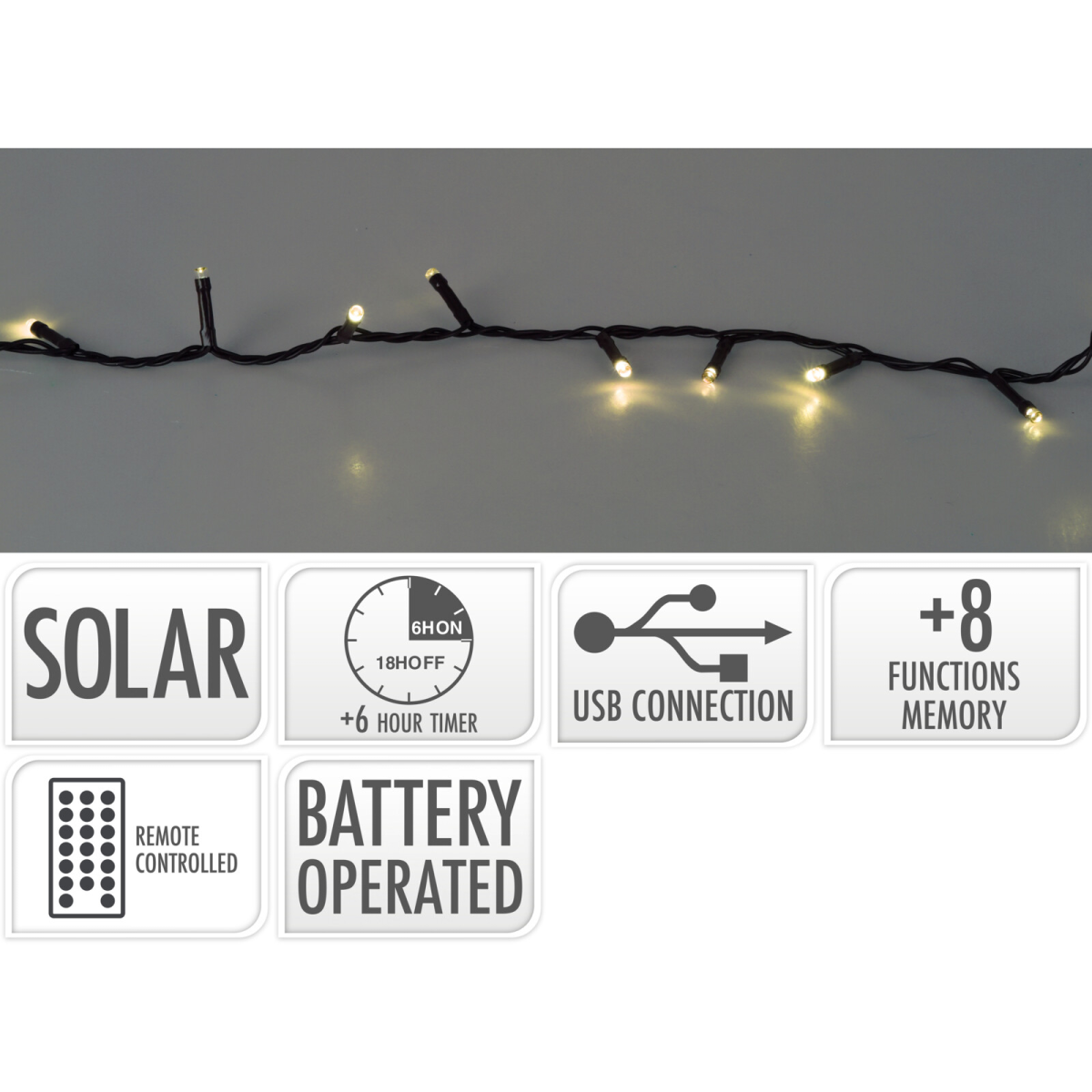 Sokoldalúan használható kültéri fénydekoráció, amely 240 darab LED izzót tartalmaz. A meleg fehér fényű izzók tiszta és modern megjelenést biztosítanak, míg a 8 különböző világítási funkció lehetővé teszi, hogy a fényeket különböző ritmusokban és mintázatokban villogtassa. A fénysor hossza 1075,5cm, a kábel hossza 300cm. Memóriával és időzítő funkcióval ellátott.