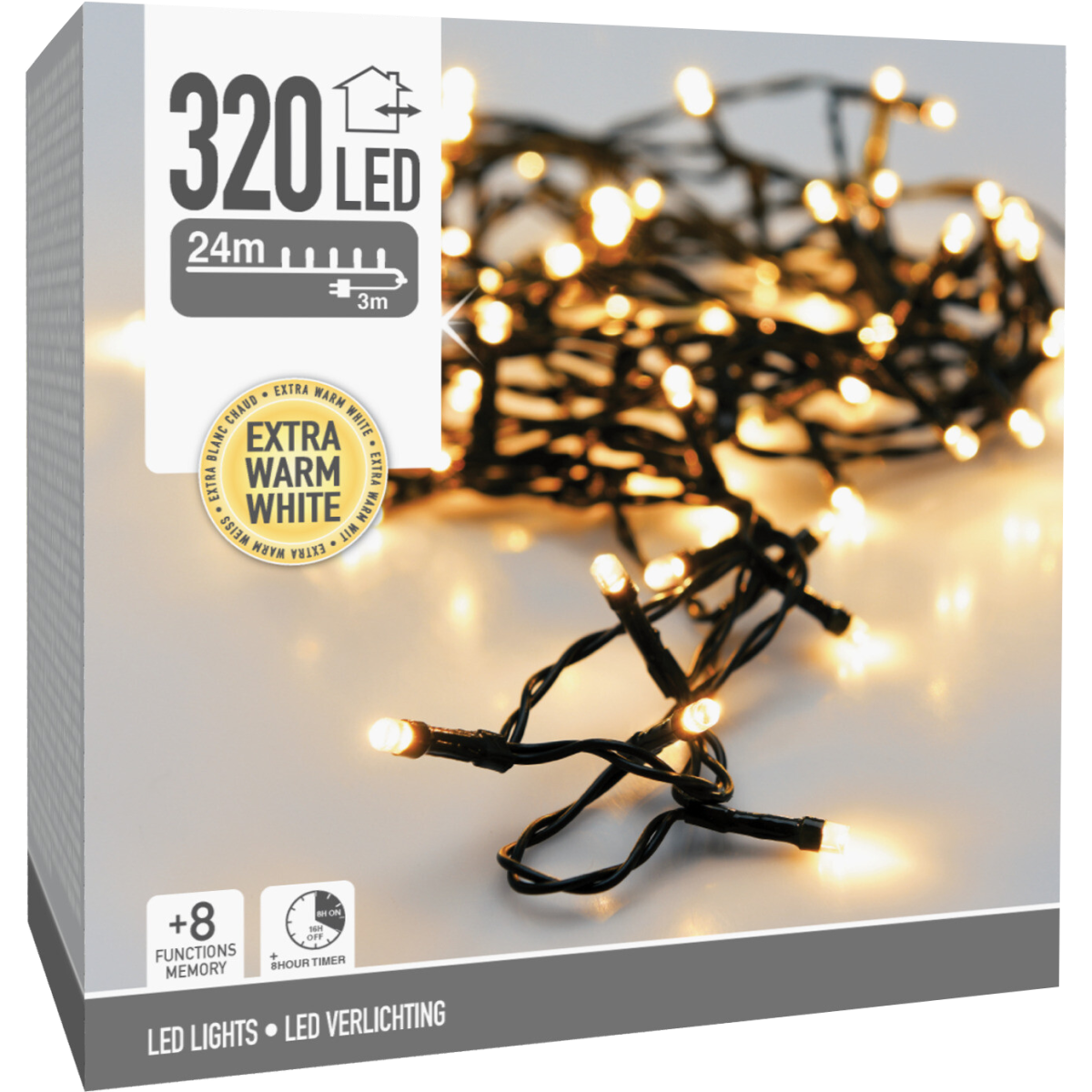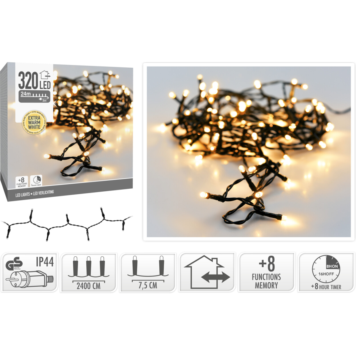 A fényfüzér egy sokoldalúan használható kültéri fénydekoráció, amely 320 darab LED izzót tartalmaz. Az extra meleg fehér fényű izzók meghitt és hangulatos megjelenést biztosítanak, míg a 8 különböző világítási funkció lehetővé teszi, hogy a fényeket különböző ritmusokban és mintázatokban villogtassa. A LED-ek egymástól való távolsága 7,5 cm. A fénysor hossza 24 méter, a hálózati kábel hossza 3 méter. Memóriával és időzítő funkcióval ellátott. Ideális kültéri használatra, legyen szó akár kerti partikról, ünnepi dekorációról vagy csak hangulatos esti világításról.