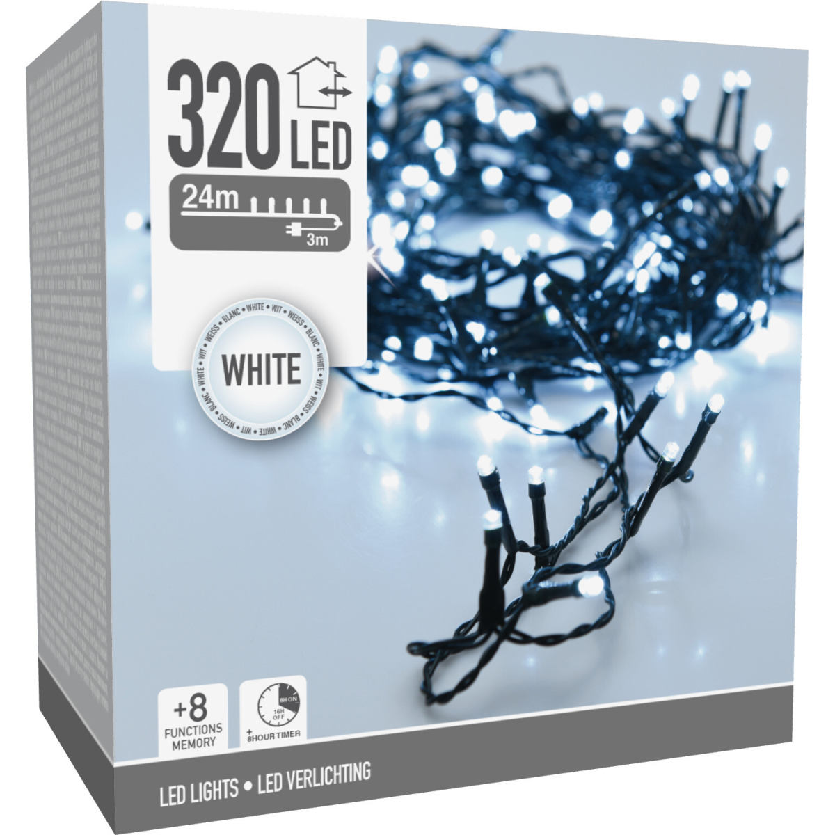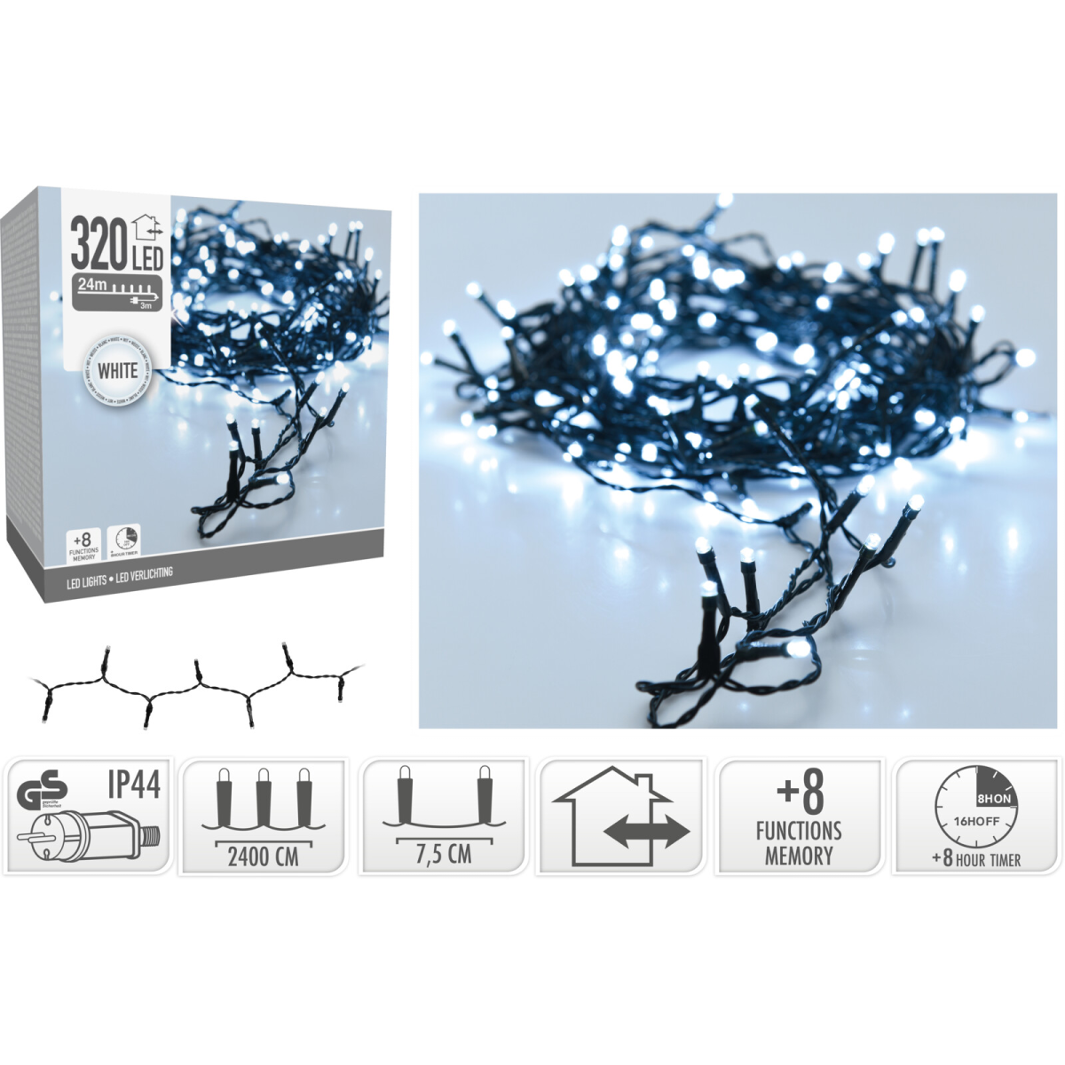 A fényfűzér egy sokoldalúan használható kültéri fénydekoráció, amely 320 darab LED izzót tartalmaz. A hideg fehér fényű izzók tiszta és modern megjelenést biztosítanak, míg a 8 különböző világítási funkció lehetővé teszi, hogy a fényeket különböző ritmusokban és mintázatokban villogtassa. A LED-ek egymástól való távolsága 7.5cm. A fénysor hossza 24 méter, a hálózati kábel hossza 3 méter. Memóriával és időzítő funkcióval ellátott. Ideális kültéri használatra, legyen szó akár kerti partikról, ünnepi dekorációról vagy csak hangulatos esti világításról.
