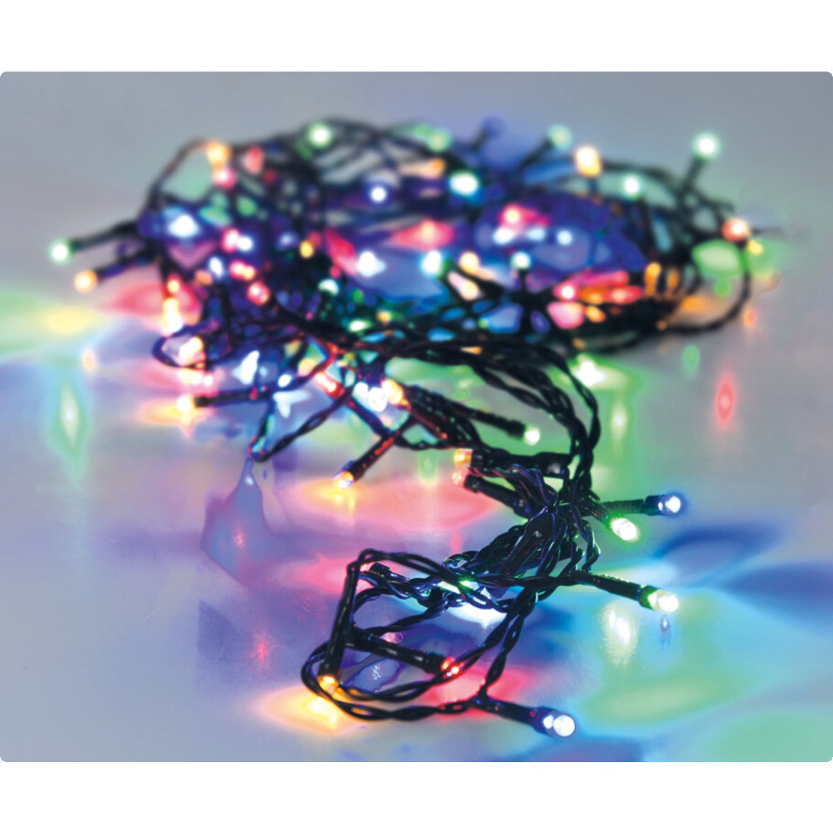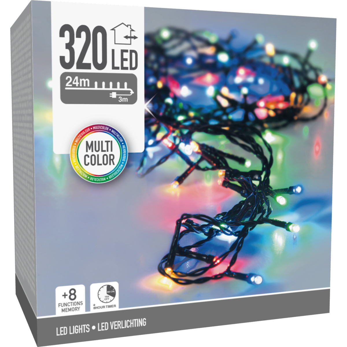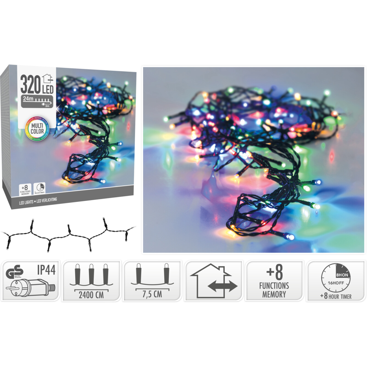 A fényfűzér egy sokoldalúan használható kültéri fénydekoráció, amely 320 darab energiatakarékos LED izzót tartalmaz. A multi - többszínű fényű izzók meghitt és hangulatos megjelenést biztosítanak, míg a 8 különböző világítási funkció lehetővé teszi, hogy a fényeket különböző ritmusokban és mintázatokban villogtassa. A LED-ek egymástól való távolsága 7.5 cm. A fénysor hossza 24 méter, a hálózati kábel hossza 3 méter. Memóriával és időzítő funkcióval ellátott. Ideális kültéri használatra, legyen szó akár kerti partikról, ünnepi dekorációról vagy csak hangulatos esti világításról.