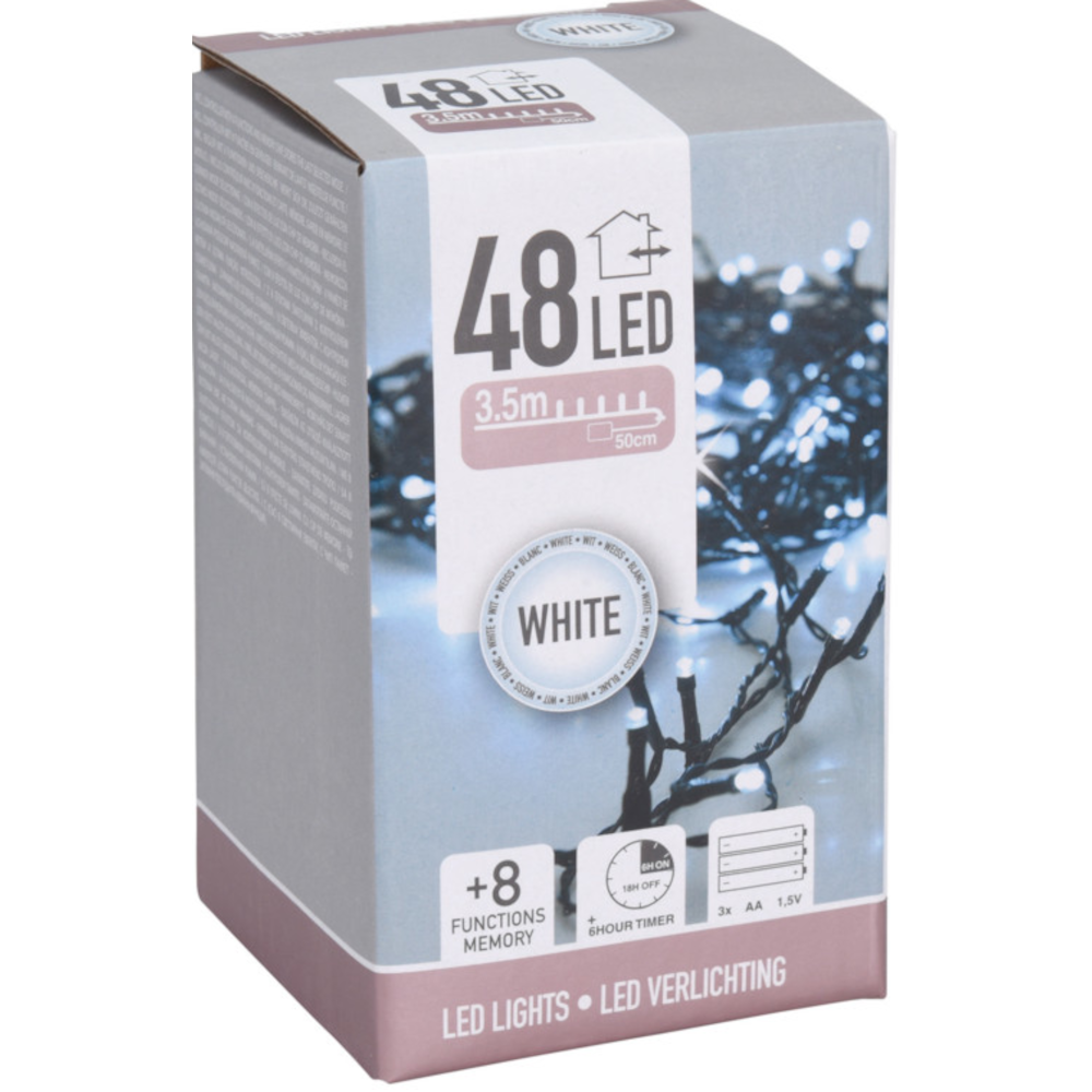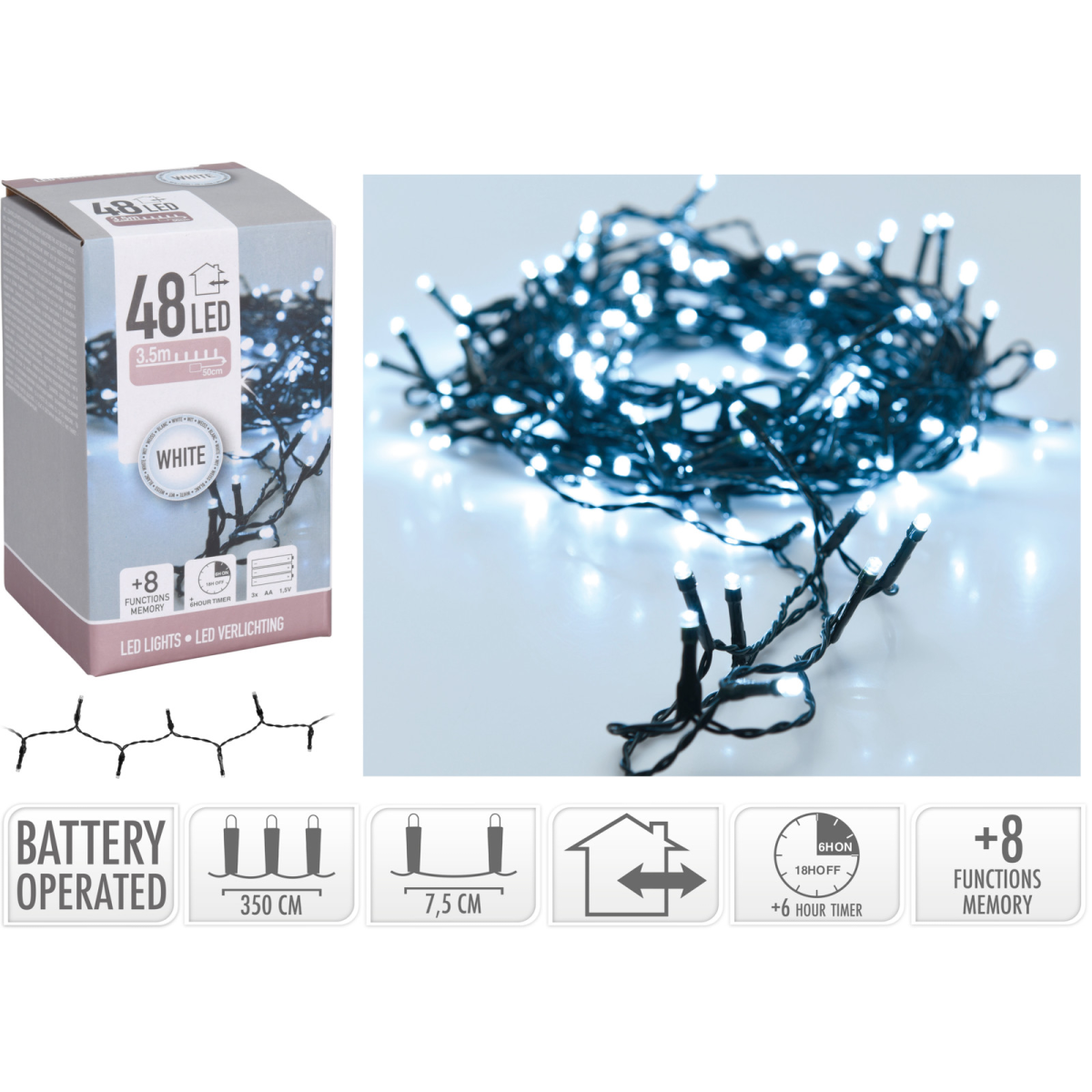 A fényfűzér egy sokoldalúan használható kültéri fénydekoráció, amely 48 darab LED izzót tartalmaz. A hideg fehér fényű izzók tiszta és modern megjelenést biztosítanak, míg a 8 különböző világítási funkció lehetővé teszi, hogy a fényeket különböző ritmusokban és mintázatokban villogtassa. A LED-ek egymástól való távolsága 7.5cm. A fénysor hossza 3.5 méter, a kábel hossza 0.5 méter. Memóriával és időzítő funkcióval ellátott. Elemmel működik (3X AA), melyek nem képezik a csomag részét. Ideális kültéri használatra, legyen szó akár kerti partikról, ünnepi dekorációról vagy csak hangulatos esti világításról.