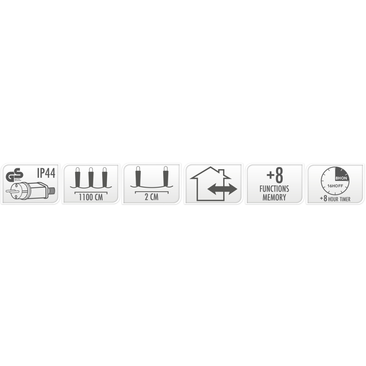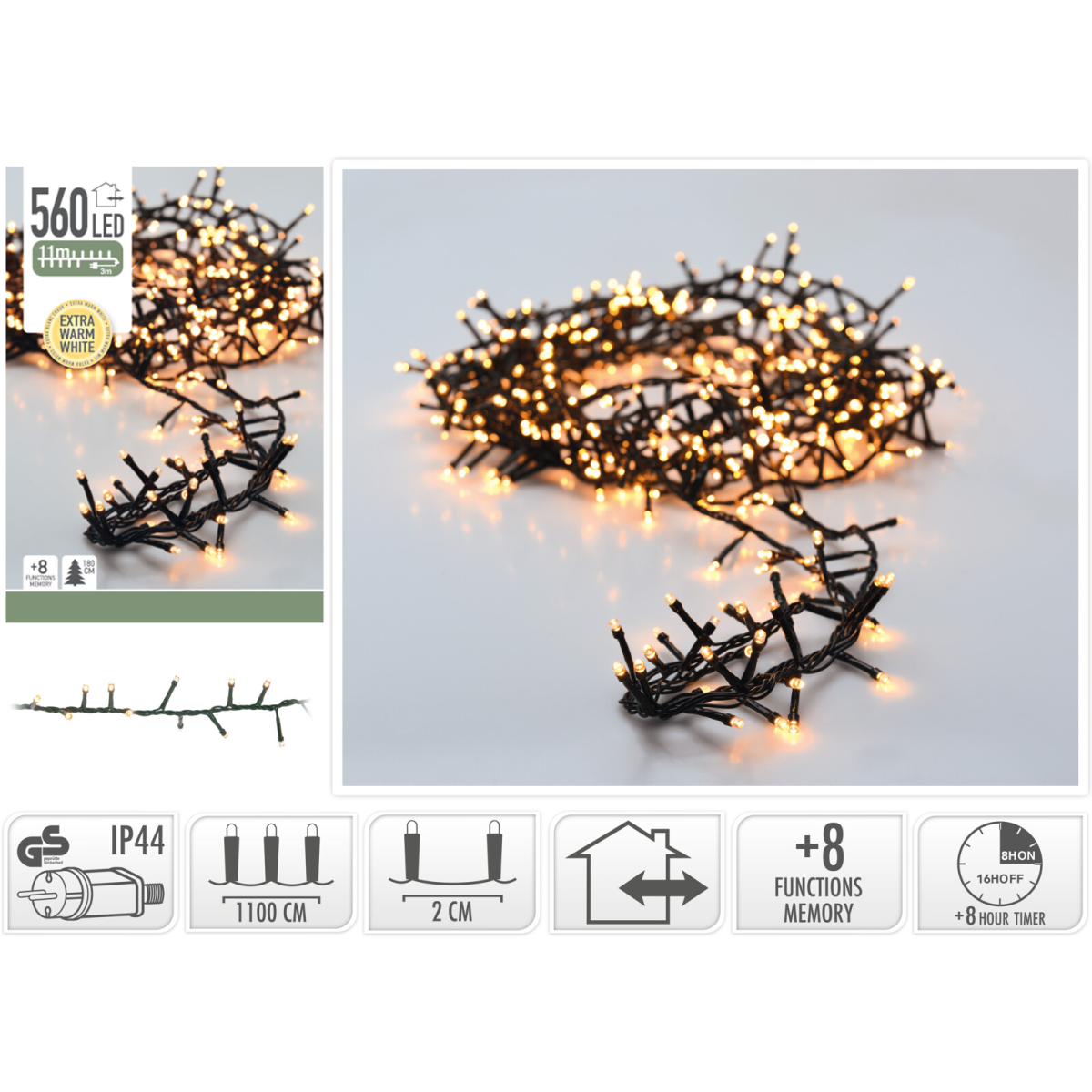 A fényfüzér egy sokoldalúan használható kültéri fénydekoráció, amely 560 darab LED izzót tartalmaz. A meleg fehér fényű izzók meghitt és hangulatos megjelenést biztosítanak. A hálózati kábel hossza 3 méter, a fénysor hossza 11 méter. 8 funkciós memóriával és 8/16 órás időzítővel rendelkezik. A LED-ek egymástól mért távolsága 2 cm. Ideális kültéri használatra, legyen szó akár kerti partikról, ünnepi dekorációról vagy csak hangulatos esti világításról. Hálózatról működik.