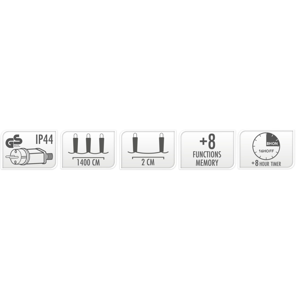A fénysor hossza 14 méter, a hálózati zöld színű kábel hossza 3 méter. Memóriával és időzítő funkcióval ellátott.