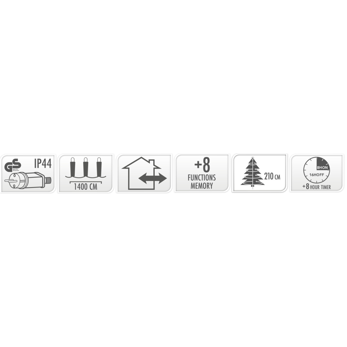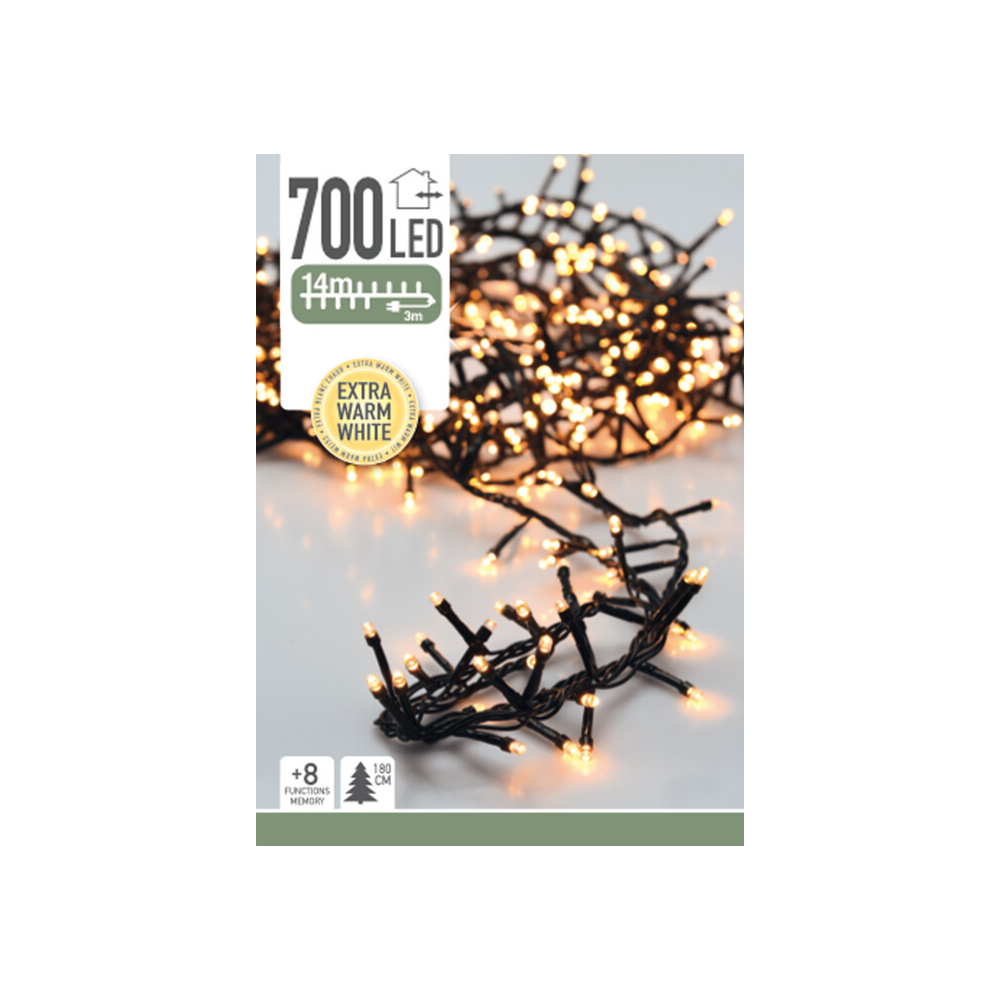 Ezen 14 méteres fényfűzér egy sokoldalúan használható kültéri fénydekoráció, amely 700 darab LED izzót tartalmaz. A meleg fehér fényű izzók meghitt és hangulatos megjelenést biztosítanak. A hálózati kábel hossza 3 méter, átlátszó színű. 8 funkciós memóriával rendelkezik. 8/16 órás időzítővel rendelkezik. Ideális kültéri használatra, legyen szó akár kerti partikról, ünnepi dekorációról vagy csak hangulatos esti világításról. Hálózatról működik.
