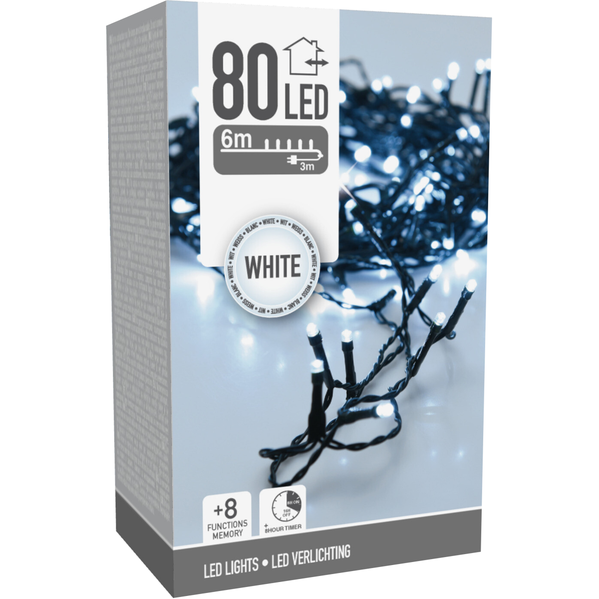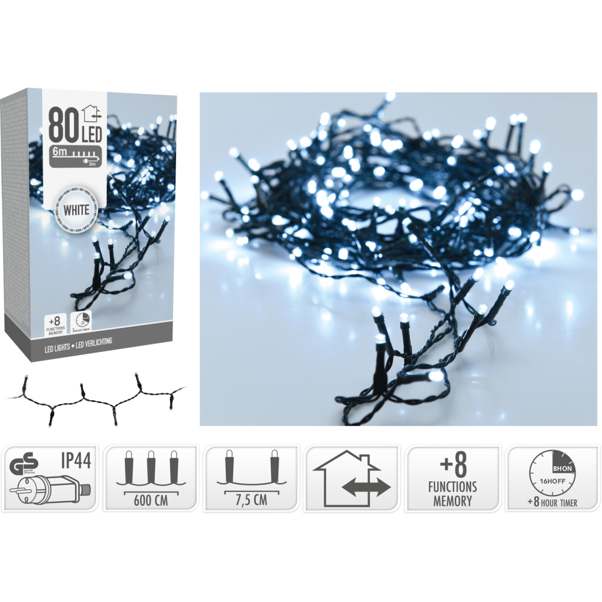 A fényfűzér egy sokoldalúan használható kültéri fénydekoráció, amely 80 darab LED izzót tartalmaz. A hideg fehér fényű izzók tiszta és modern megjelenést biztosítanak, míg a 8 különböző világítási funkció lehetővé teszi, hogy a fényeket különböző ritmusokban és mintázatokban villogtassa. A LED-ek egymástól való távolsága 7.5cm. A fénysor hossza 6 méter, a hálózati kábel hossza 3 méter. Memóriával és időzítő funkcióval ellátott. Ideális kültéri használatra, legyen szó akár kerti partikról, ünnepi dekorációról vagy csak hangulatos esti világításról.
