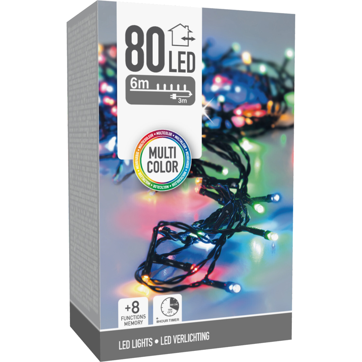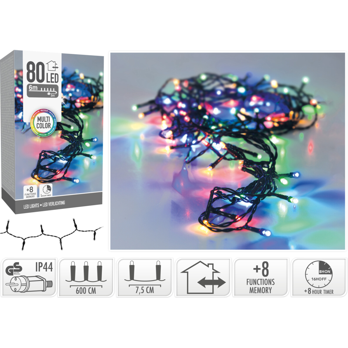 A fényfűzér egy sokoldalúan használható kültéri fénydekoráció, amely 80 darab energiatakarékos LED izzót tartalmaz. A multi - többszínű fényű izzók meghitt és hangulatos megjelenést biztosítanak, míg a 8 különböző világítási funkció lehetővé teszi, hogy a fényeket különböző ritmusokban és mintázatokban villogtassa. A LED-ek egymástól való távolsága 7.5cm. A fénysor hossza 6 méter, a hálózati kábel hossza 3 méter. Memóriával és időzítő funkcióval ellátott. Ideális kültéri használatra, legyen szó akár kerti partikról, ünnepi dekorációról vagy csak hangulatos esti világításról. A ragyogó fények tökéletesen kiegészítik a karácsonyi dekorációt és meghitt hangulatot teremtenek, így tökéletes választás ez a karácsonyi dekorációs termék.