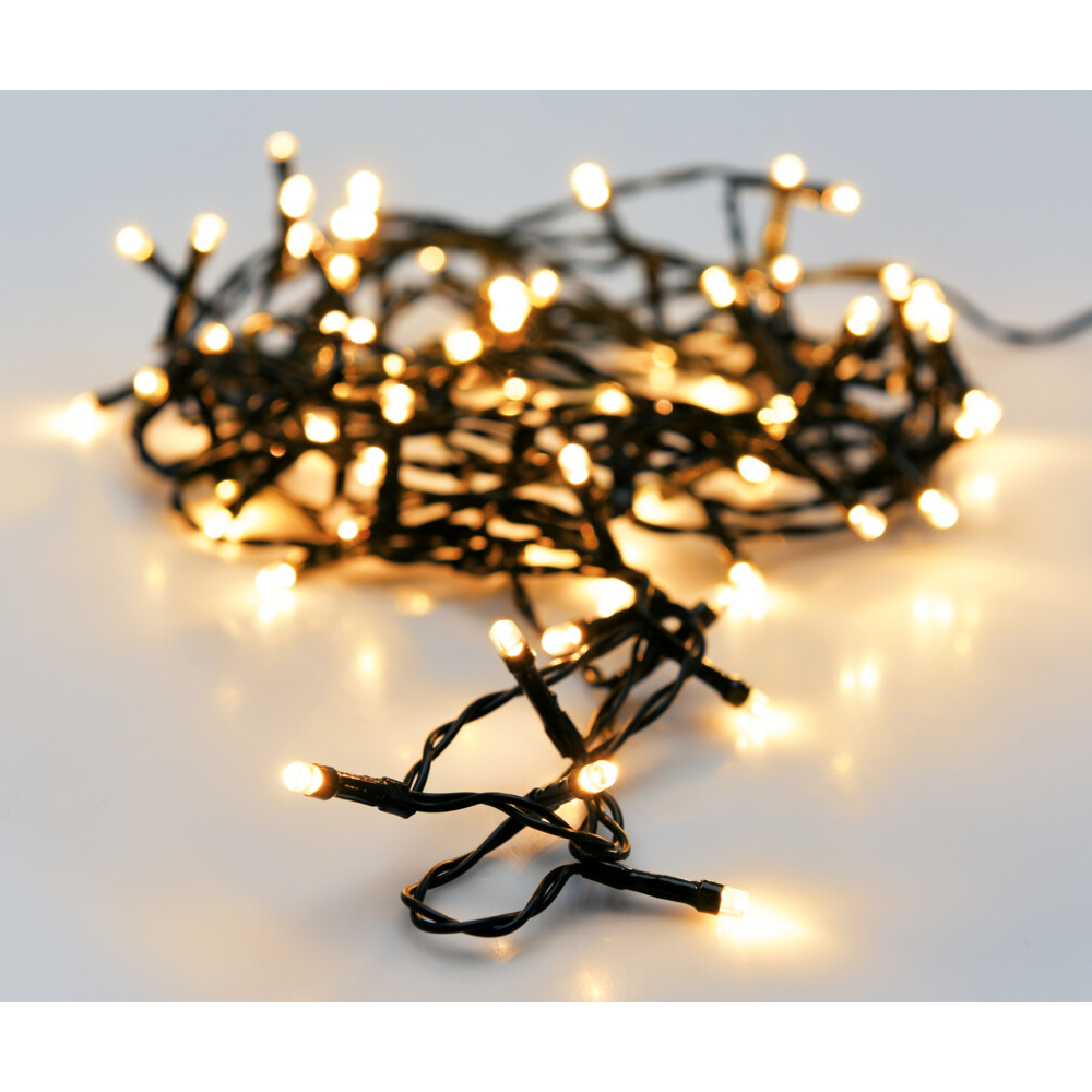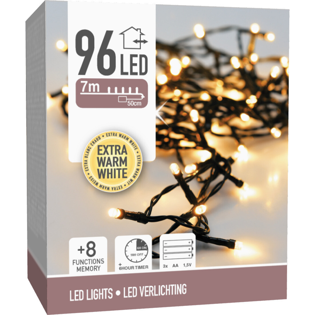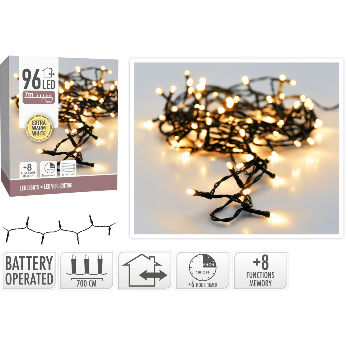 A fényfűzér egy sokoldalúan használható kültéri fénydekoráció, amely 96 darab LED izzót tartalmaz. A extra meleg fehér fényű izzók meghitt és hangulatos megjelenést biztosítanak. A LED-ek közötti távolság 7.5 cm. A hálózati kábel hossza 0.5 méter, a fénysor hossza 7 méter. 8 funkciós memóriával rendelkezik. 8/16 órás időzítővel rendelkezik. Ideális kültéri használatra, legyen szó akár kerti partikról, ünnepi dekorációról vagy csak hangulatos esti világításról. Elemmel működik, 3X AA, elemet nem tartalmaz.