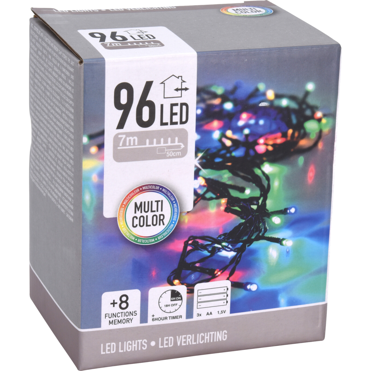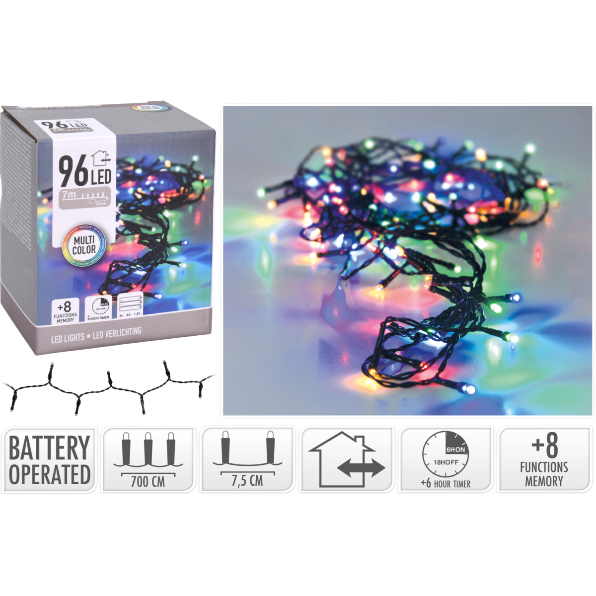 A fényfűzér egy sokoldalúan használható kültéri fénydekoráció, amely 96 darab LED izzót tartalmaz. A sokszínű izzók meghitt és hangulatos megjelenést biztosítanak, míg a 8 különböző világítási funkció lehetővé teszi, hogy a fényeket különböző ritmusokban és mintázatokban villogtassa. A LED-ek egymástól való távolsága 7.5cm. A fénysor hossza 7 méter, a kábel hossza 0.5 méter. Memóriával és időzítő funkcióval ellátott. Elemmel működik (3xAA), melyek nem képezik a csomag részét. Ideális kültéri használatra, legyen szó akár kerti partikról, ünnepi dekorációról vagy csak hangulatos esti világításról.