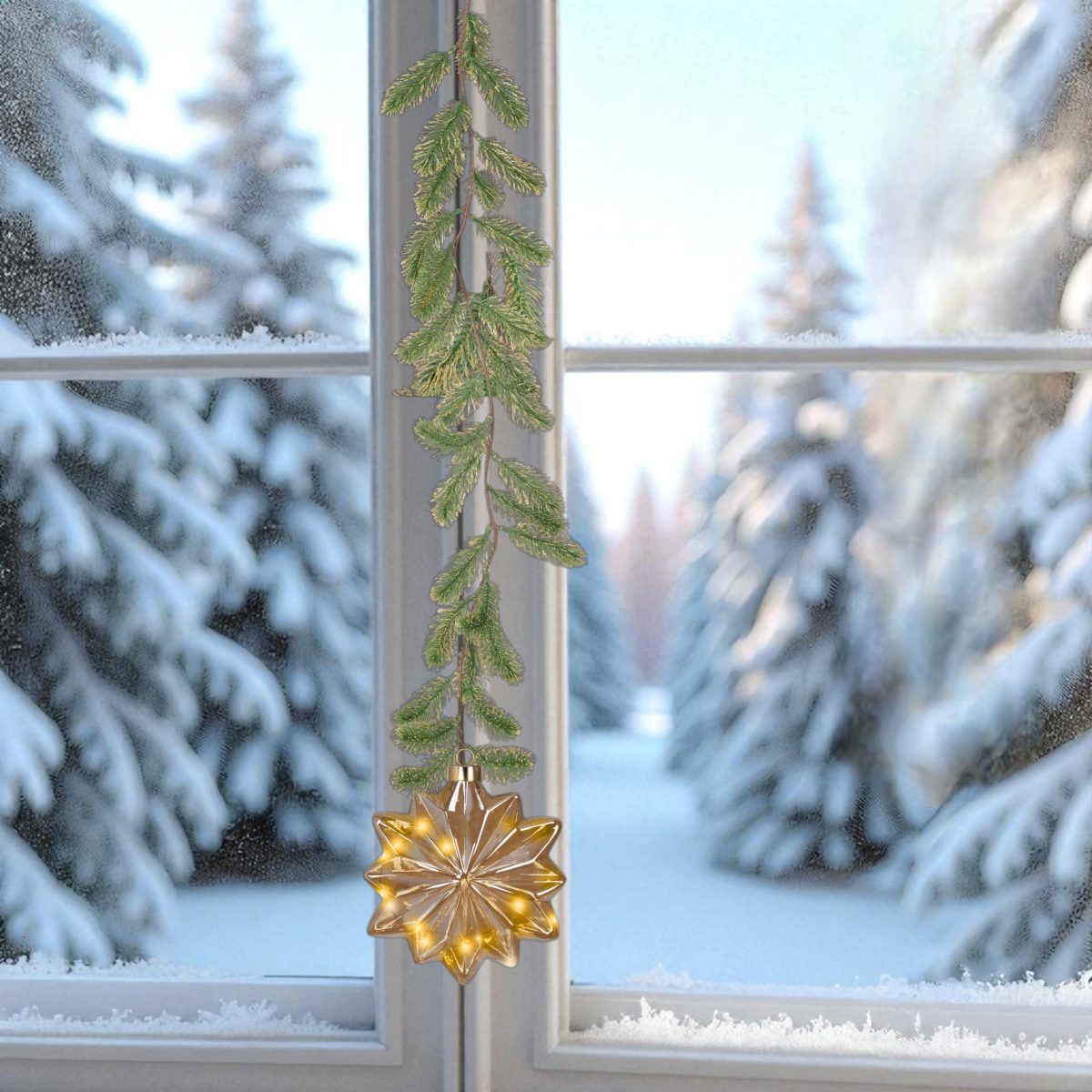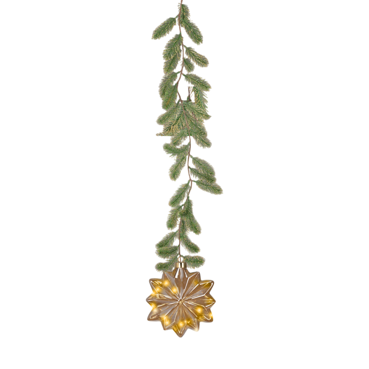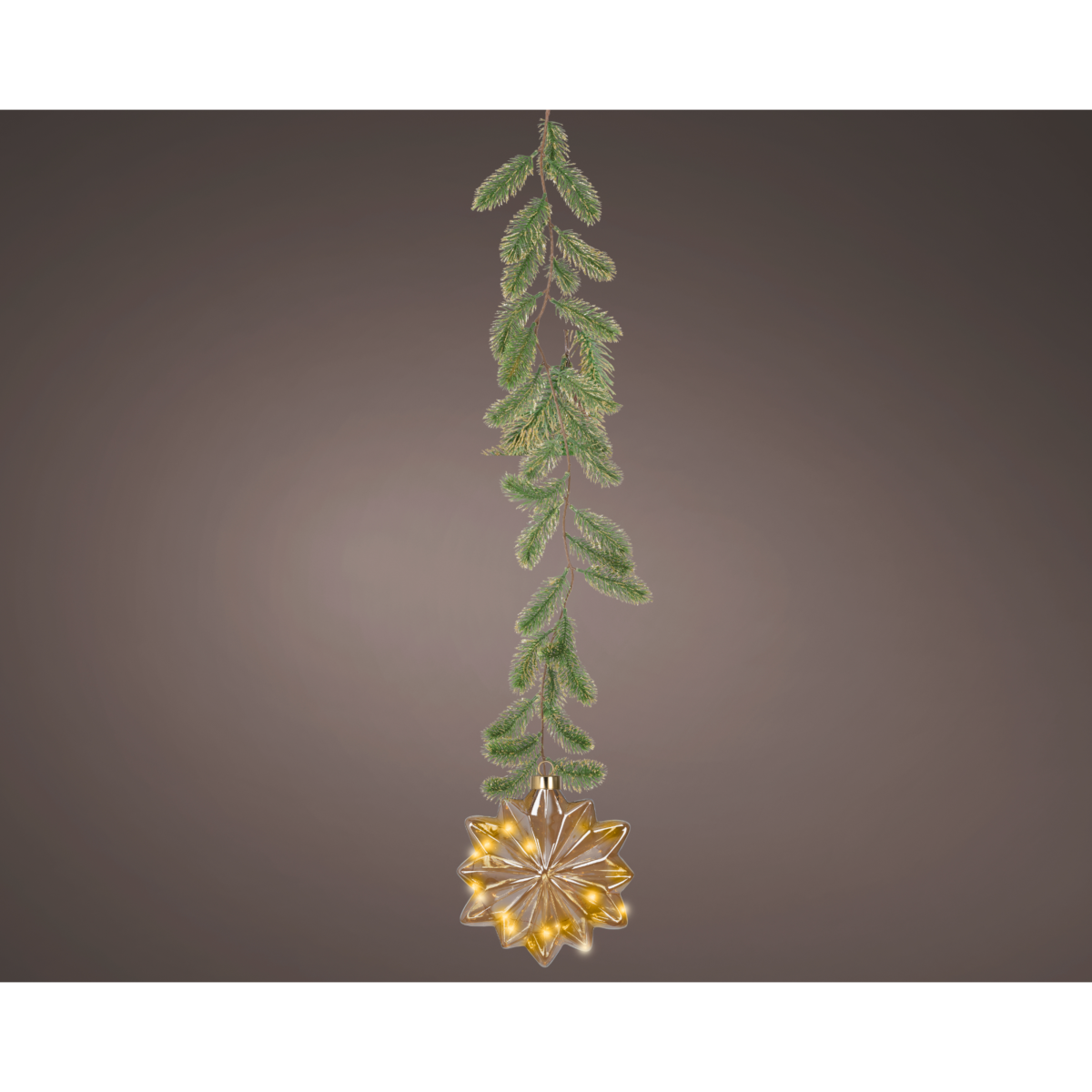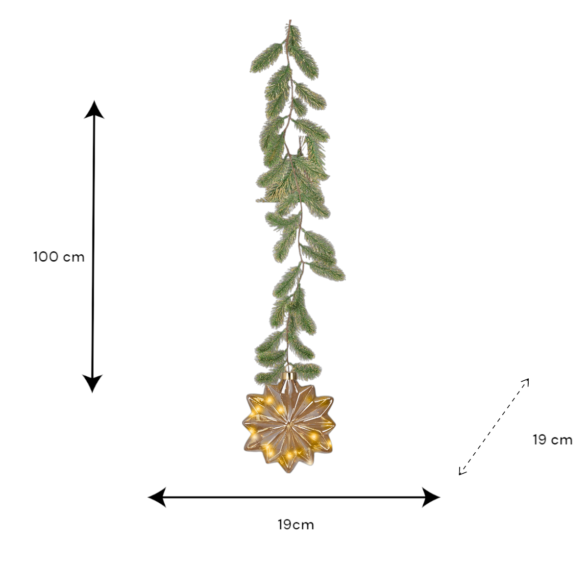 Ez az egyedi, virág alakú akasztós dísz egy fényfüzérbe épített 15 db melegfehér LED-del világít, és 100 cm-es hosszúságának köszönhetően ideális ablakba, ajtókeretre vagy fali dekorációként is. A letisztult vonalvezetésű virág aranyos árnyalata és a természetes hatású fenyőág kombinációja harmonikus, ünnepi összhatást nyújt. Beltéri használatra készült (IP20).