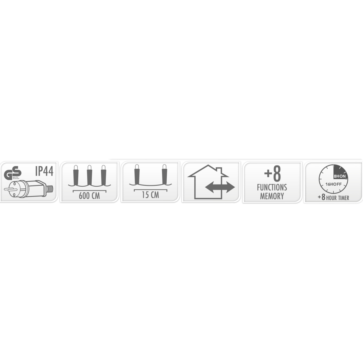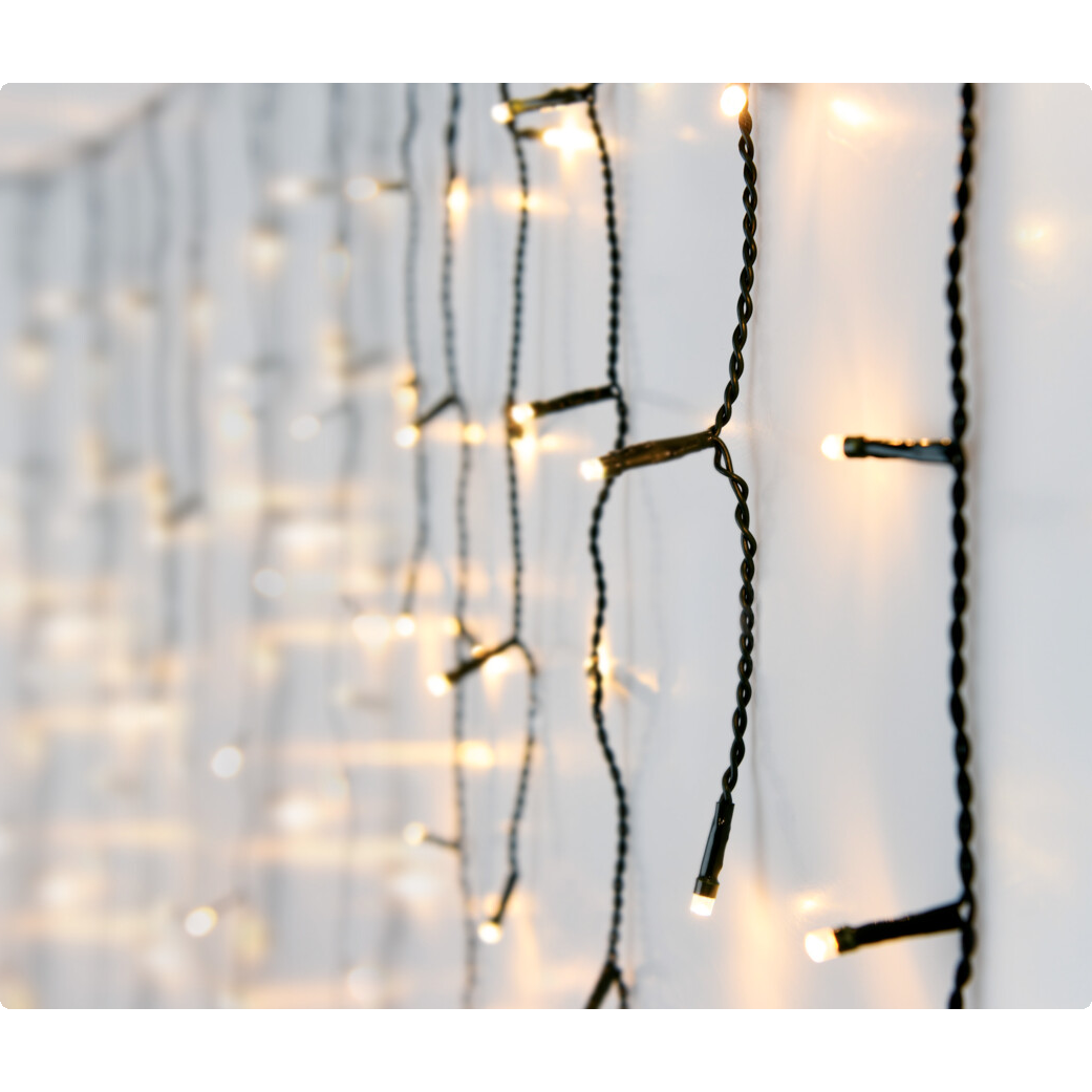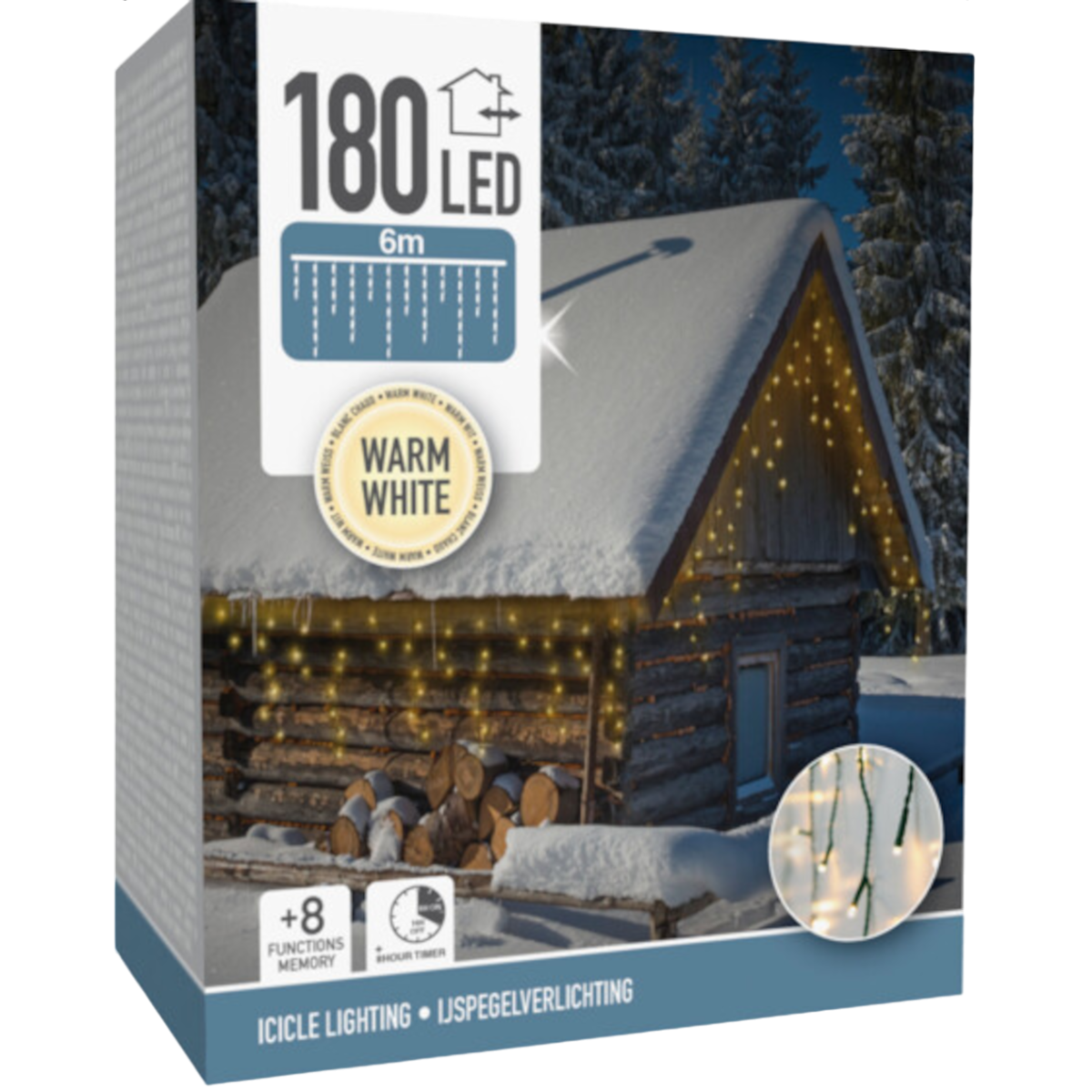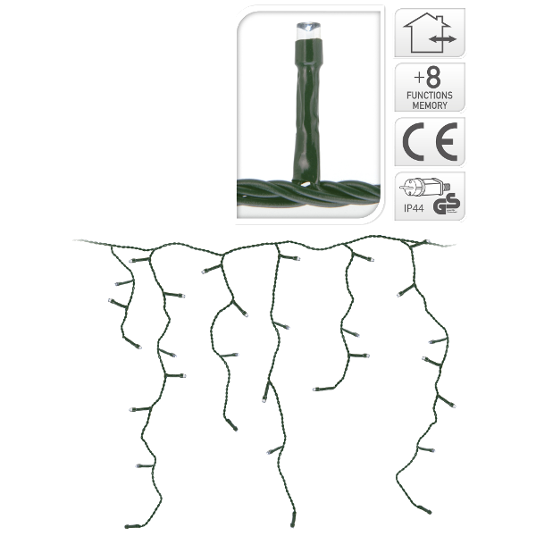 6 méteres, 180 melegfehér LED-es jégcsap fényfüzér, 5 mm-es gömbökkel, 3 méter zöld vezetékkel; 15 cm-es távolság van a LED-ek között. 8 funkciós memóriás vezérlővel. IP44 védettségű elektromos adapterrel. A hálózatról működő termék időkapcsolós; bekapcsolástól számított 8 órán keresztül működik, majd automatikusan lekapcsol és 16 óra múlva automatikusan bekapcsol. Ezzel a fényfüzérrel feldobhatjuk otthonunk külsejét is, mellyel igazán kellemes hangulatot teremthetünk. Varázsold ünnepi hangulatba otthonodat ezzel a gyönyörű kültéri karácsonyi fényfüzérrel! A ragyogó fények tökéletesen kiegészítik a karácsonyi dekorációt, és meghittséget hoznak. Egyszerűen használható így gondtalanul élvezheted az ünnepi fényeket!