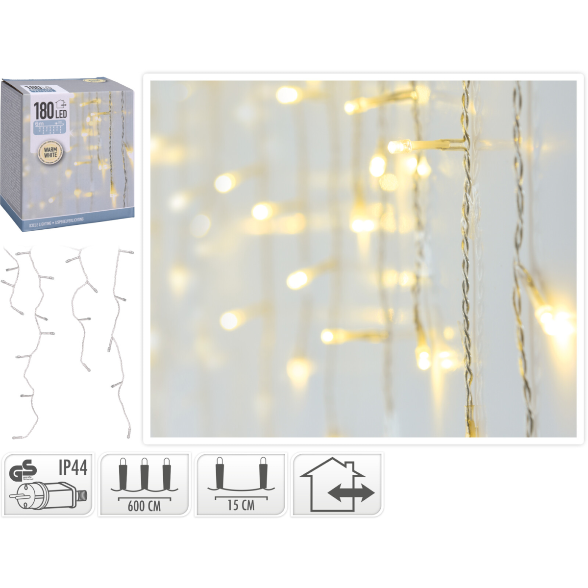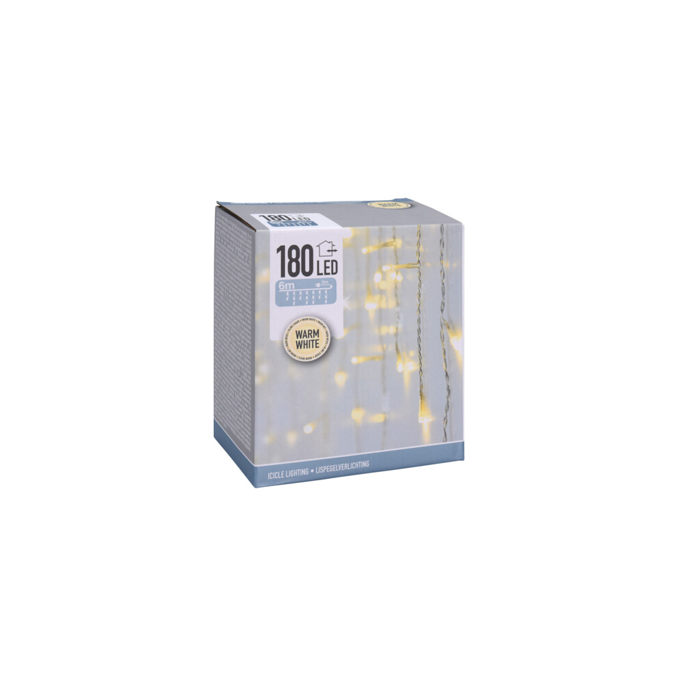 Varázsolj meghitt ünnepi hangulatot otthonodba ezzel a gyönyörű karácsonyi jégcsap fényfüzérrel. Ragyogó fénye tökéletesen kiegészíti a karácsonyi dekorációt. Kül- és beltéri dekorálásra egyaránt alkalmas, 6 m hosszú 180 LED-es melegfehér fényfüzér, 5 mm-es gömbökkel, 15 cm távolsággal a LED-ek között, 3 méteres zöld színű vezetékkel. Hálózatról működik, IP44 elektromos adapterrel. Vezeték keresztmetszet: 0,15 mm2.
