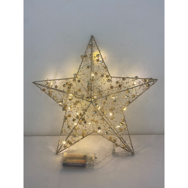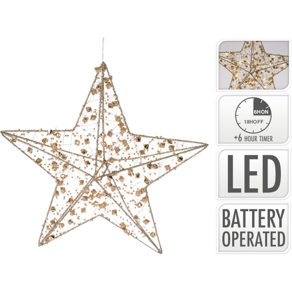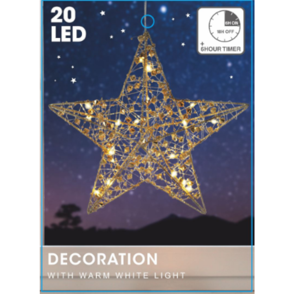 Beltéri dekoráláshoz, ünnepi díszítésként kiváló választás a meghitt hangulatot árasztó, 20 db meleg fehér fényű LED-es karácsonyi fény csillag. Mérete: 30x8x30 cm. Arany színű, anyaga polyvinyl és fém. 2xAA elemmel működik, amelyet a termék nem tartalmaz. Időkapcsoló funkcióval, valamint 1,5 m hosszú vezetékkel rendelkezik.
