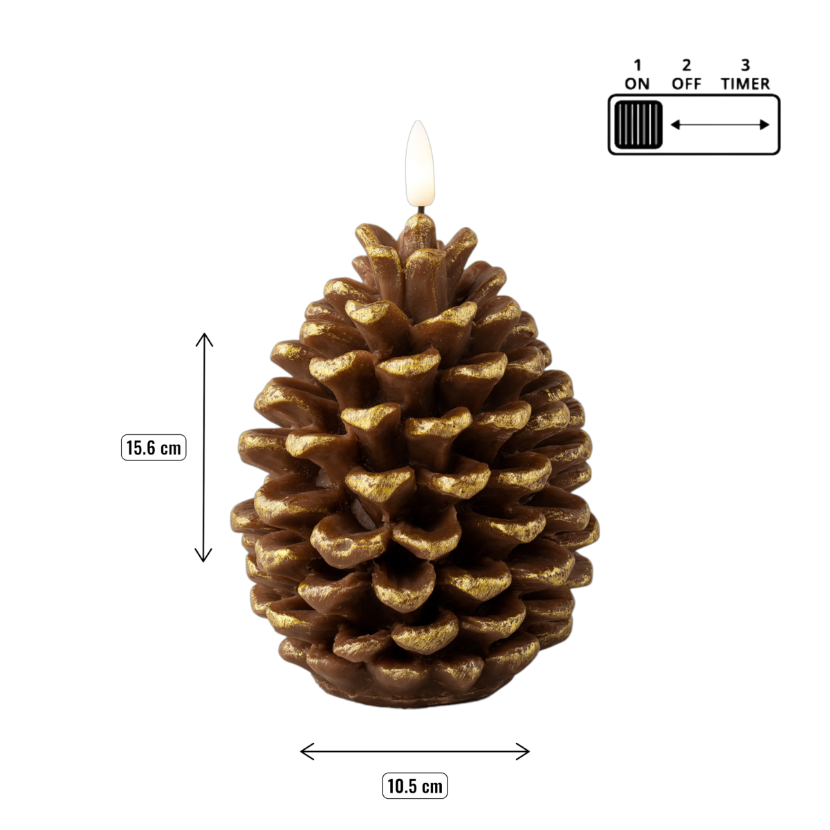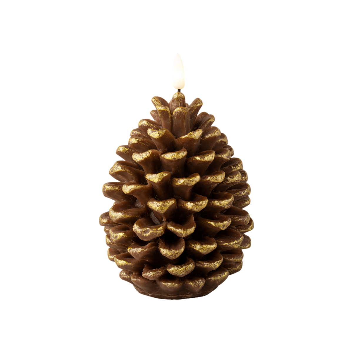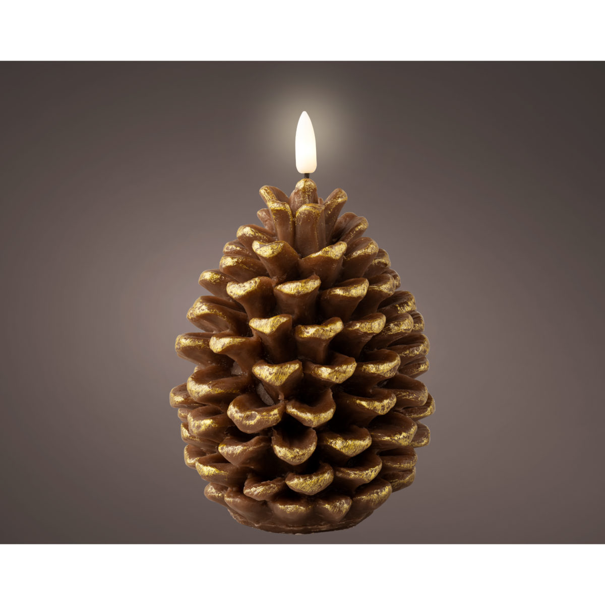 Ez a különleges toboz formájú LED-es gyertya dekoratív megjelenésével és melegfehér fényével hangulatos kiegészítője lehet az ünnepi időszaknak. A részletesen kidolgozott, viaszborítású forma arany színnel kiemelt szegélyekkel még természetesebb hatást kelt. Belső tereken használható, fix fényű kialakítással.