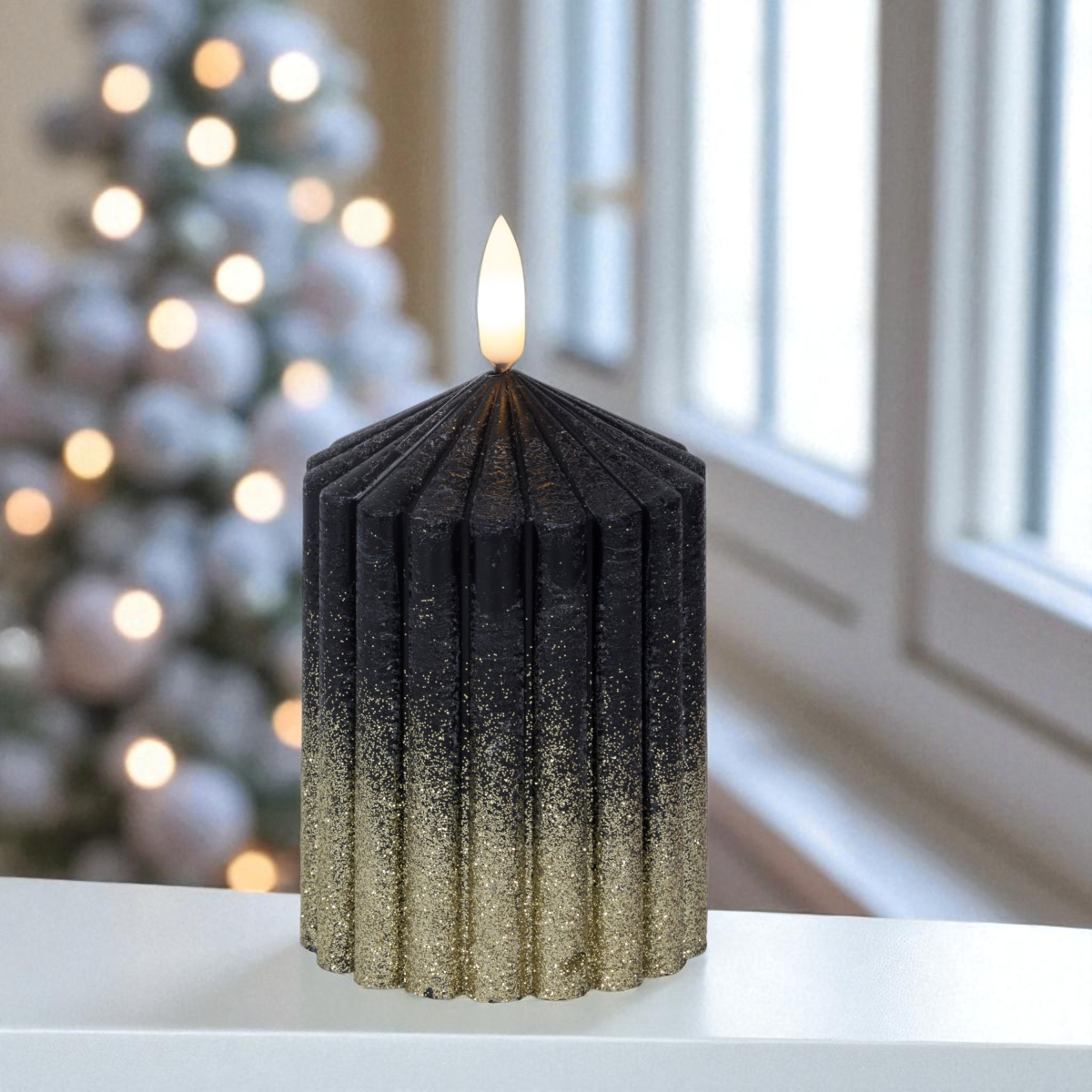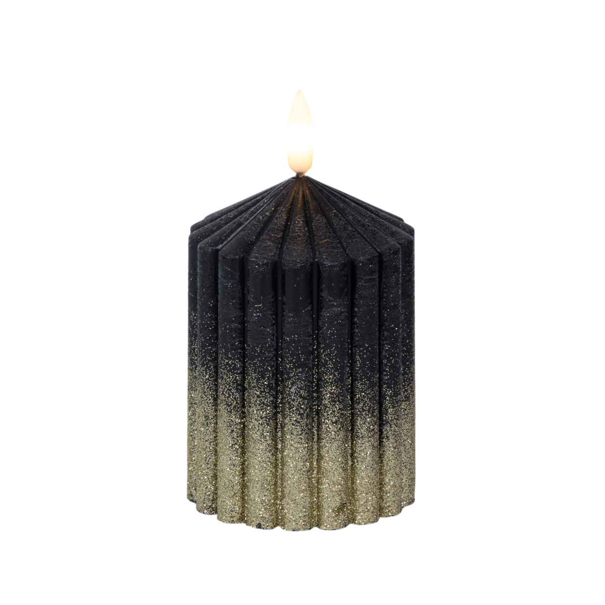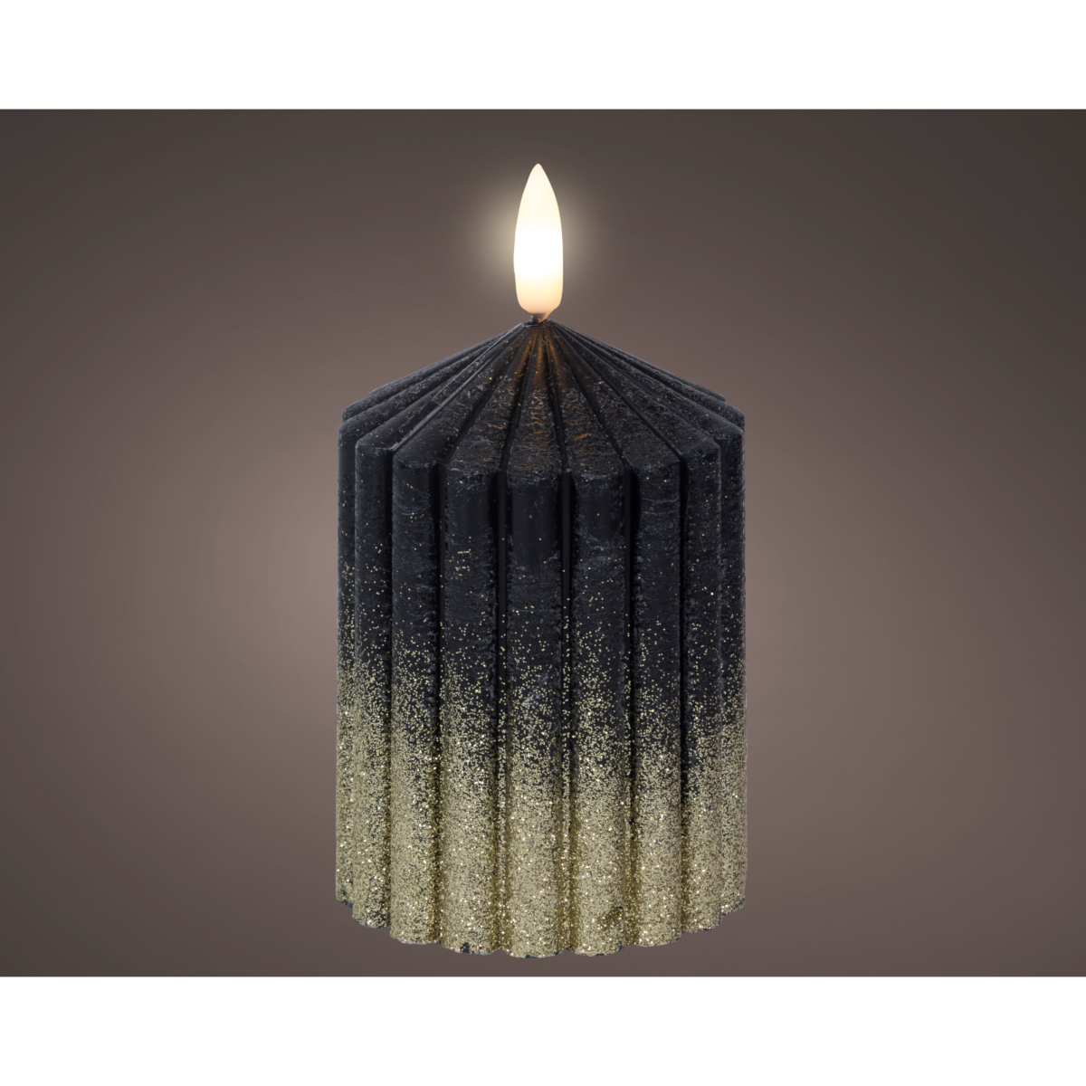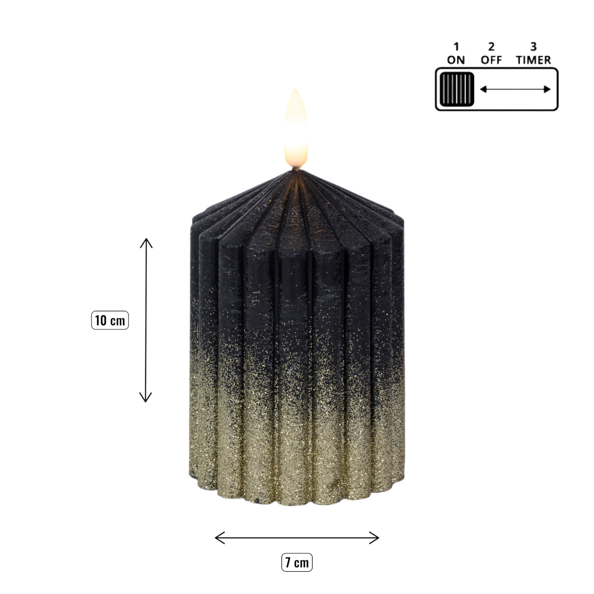 Ez a 10 cm magas, fekete-arany színátmenetes LED-es gyertya különleges megjelenésével elegáns hangulatot teremt. A melegfehér fényű LED láng biztonságos és energiatakarékos alternatívát kínál a hagyományos gyertyákkal szemben. Barázdált felülete és arany csillámdekorációja exkluzív hatást kölcsönöz, így akár önálló díszként is megállja a helyét.