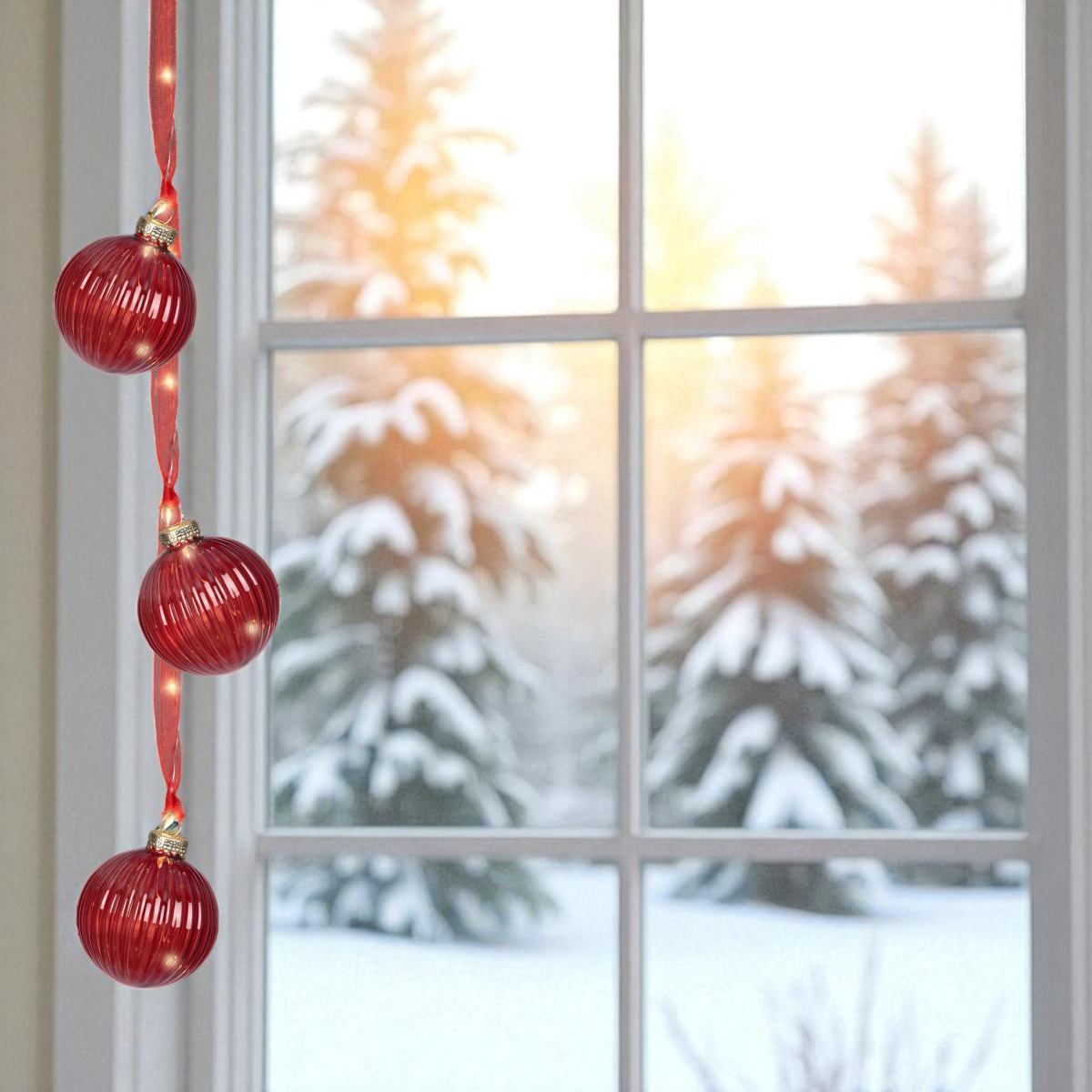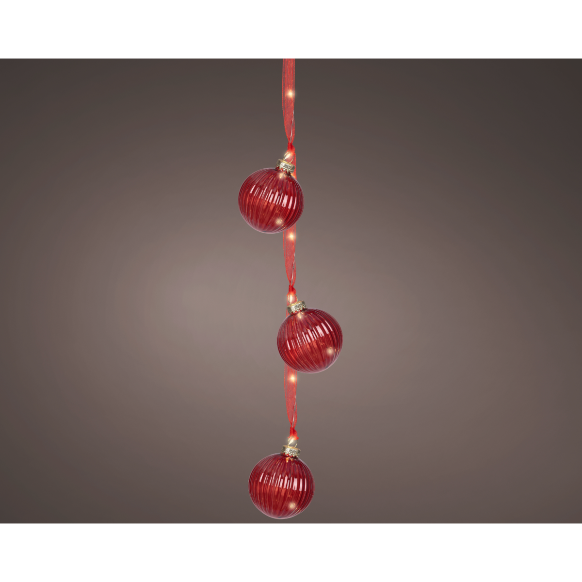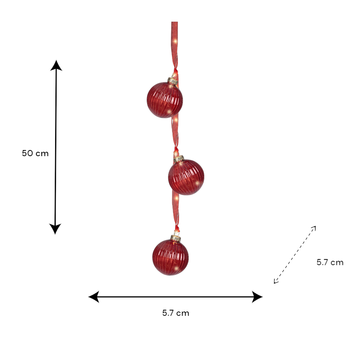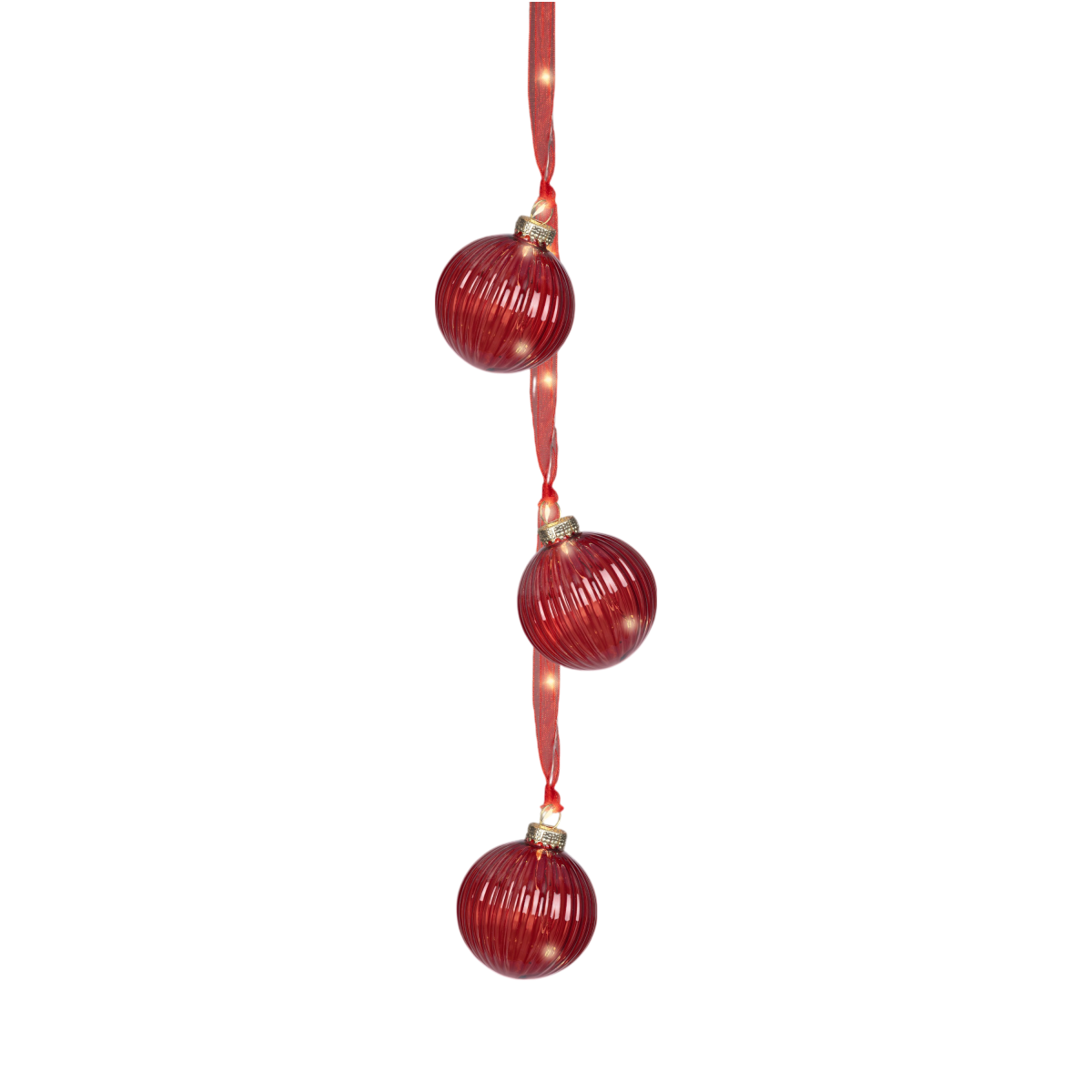 Ez a különleges LED-es gömbfüzér három piros bordázott díszgömbből és 15 darab melegfehér LED-ből áll, amelyek látványosan végigfutnak a dekoráció teljes hosszán. A 50 cm hosszú szalag IP20 védettségű, így kizárólag beltéri használatra alkalmas. Az elemes működésnek köszönhetően könnyedén elhelyezhető ajtóra, ablakba vagy karácsonyfára.