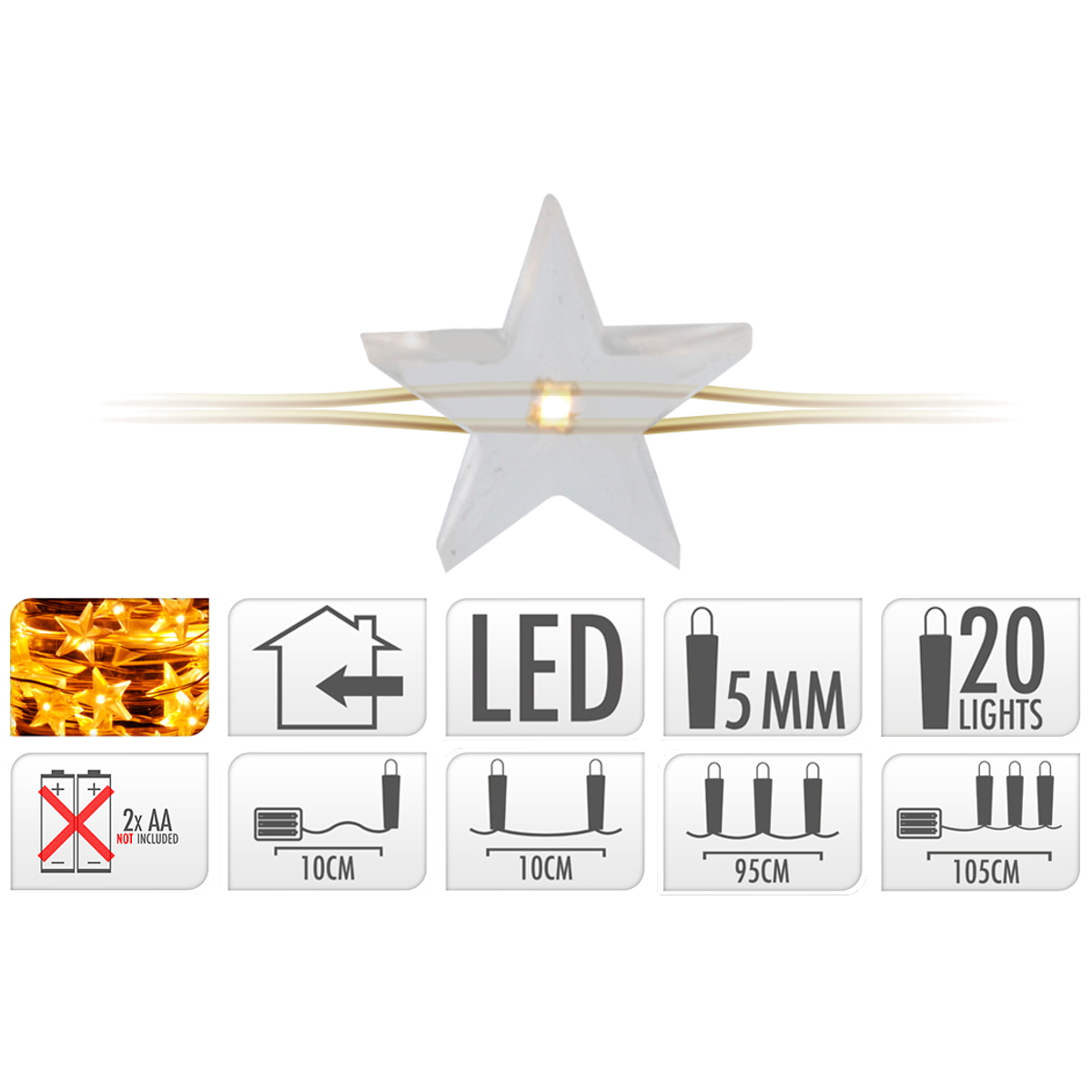 20 db extra meleg fehér fényű LED fényfüzér, csillag alakú LED-del, beltéri használatra. 95 cm hosszú, 2xAA elemmel működik (Az elem nem tartozék!)