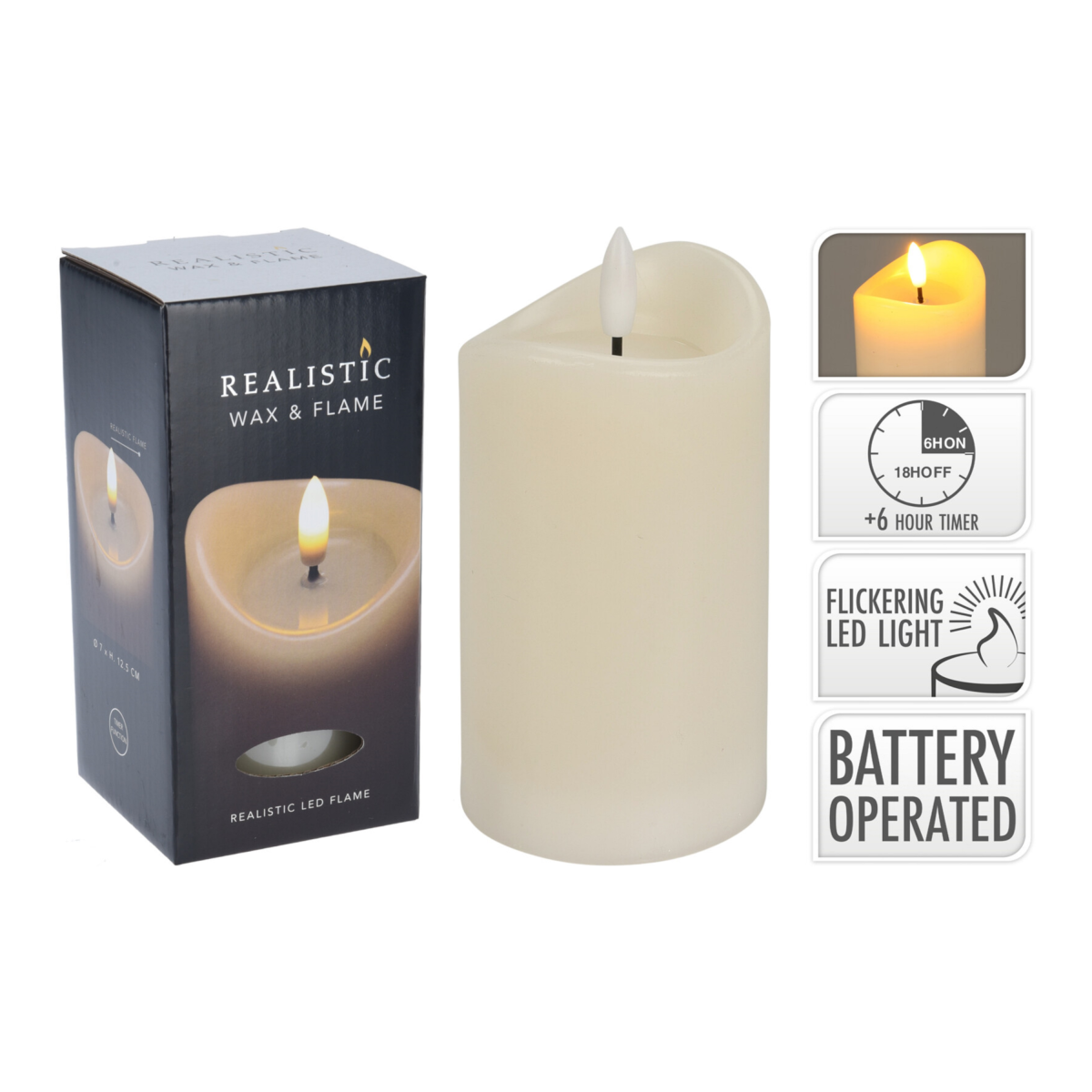 Különleges időzítős karácsonyi LED-es gyertya, mely a karácsony varázsát hozza el. A gyertya pislákoló fénye élethűen utánozza a valódi gyertya lángját. Nemcsak meleg fényt és ünnepi hangulatot áraszt, hanem praktikus időzítő funkciójának köszönhetően még kényelmesebbé teszi az ünnepi készülődést. Az időzítő funkció aktiválása után a gyertya 6 óra világítás után automatikusan kikapcsol, majd 18 óra elteltével ismételten világítani kezd. A termék 2X AAA elemmel működik, mely nem tartozéka a terméknek.