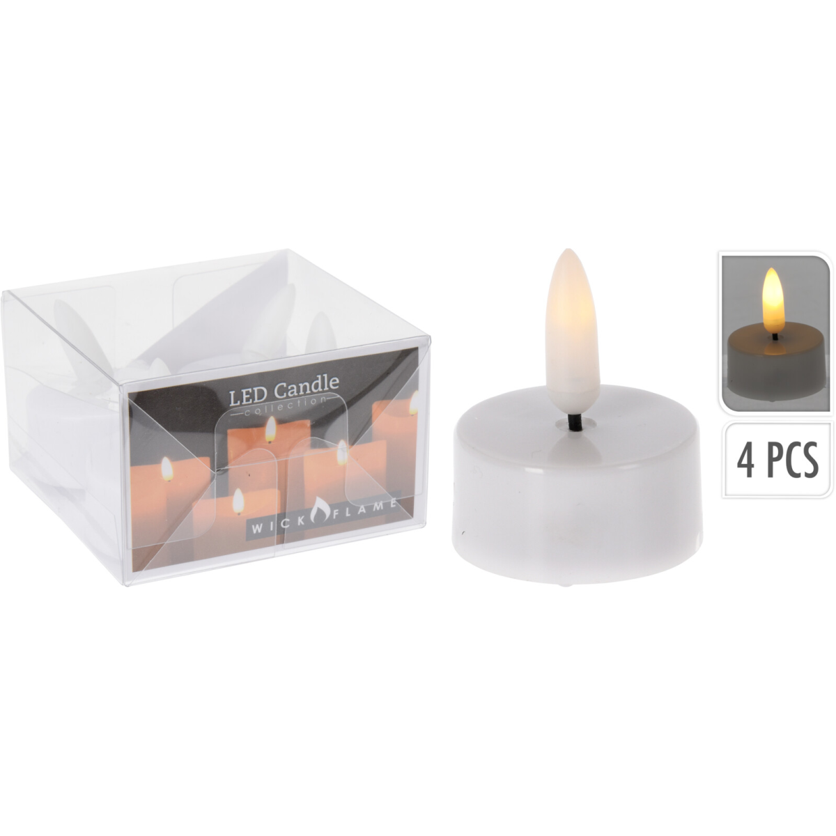 Négy darabos ledes mécses szett, fehér színben, polipropilén anyagból, 1 x CR2032 elemmel működik. Az elemet a termékek tartalmazzák.