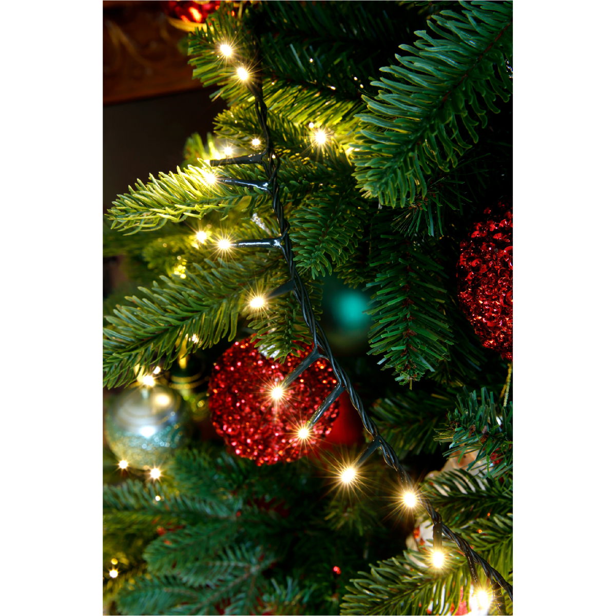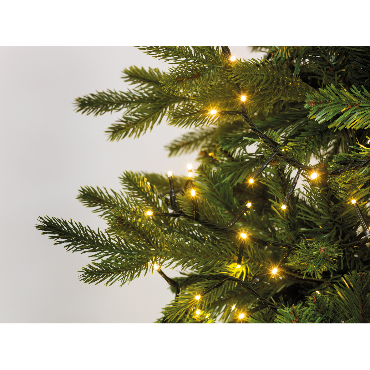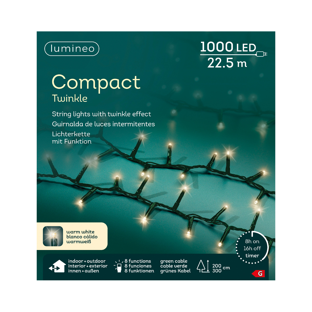 Kül- és beltéri használatra egyaránt alkalmas fényfüzér időzítővel. 1000 LED-el, meleg fehér fénnyel és zöld kábellel. A LED-eket nem lehet cserélni.