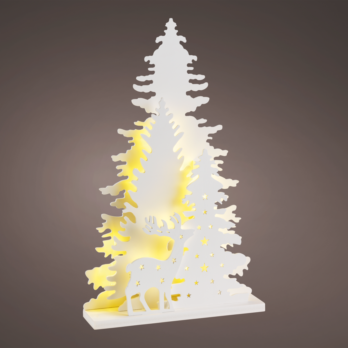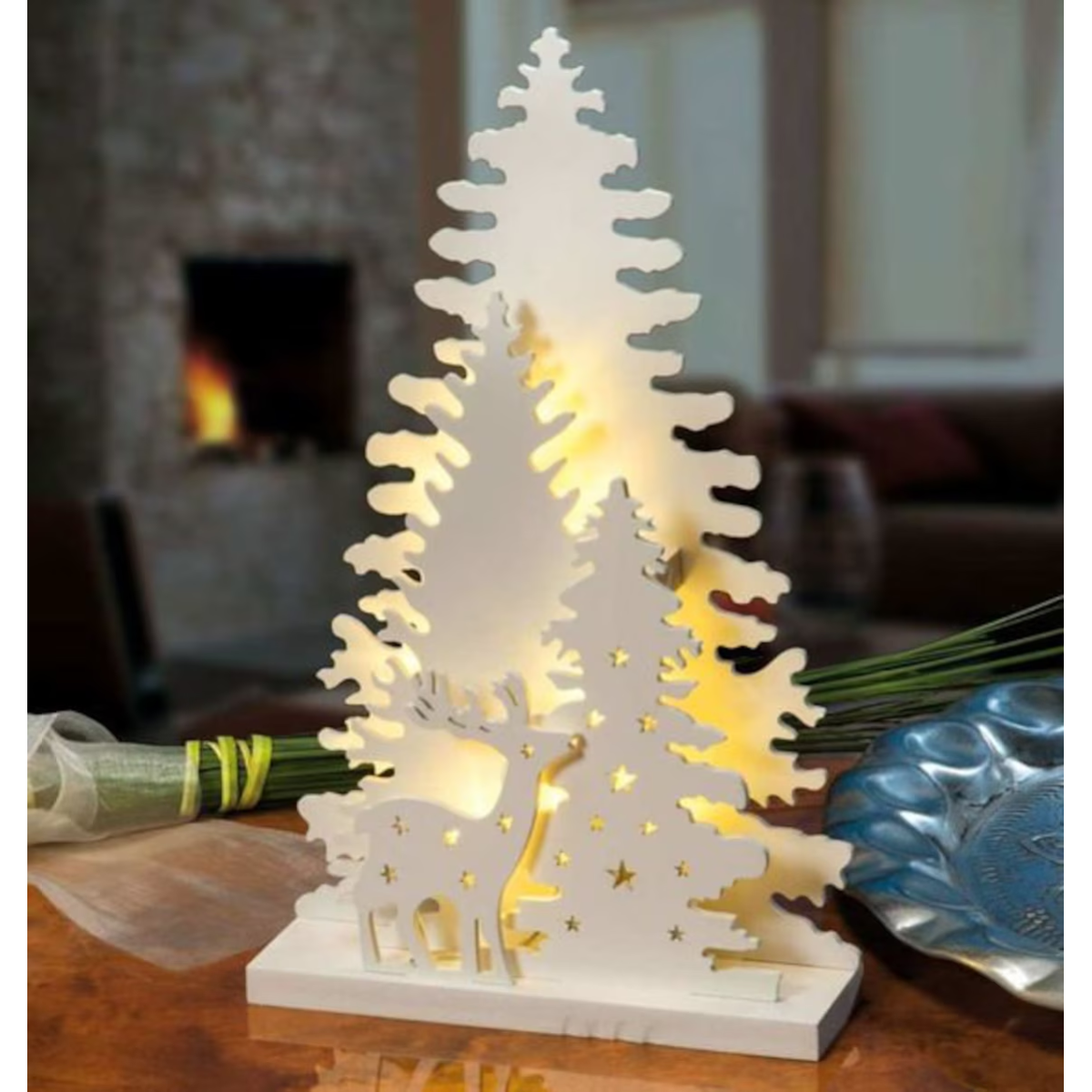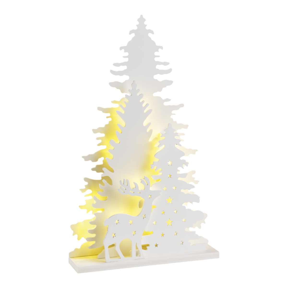 Dekor világító fa szett meleg fehér fényekkel. 36 cm magas, remek karácsonyi hangulatot áraszt, könnyen kombinálható, díszíthető más karácsonyi díszekkel. 3 db AA elemmel működik, melyet a termék nem tartalmaz. Beépített időzítővel, 6 óra bekapcsolt állapot után az égők automatikusan kikapcsolnak. A készülék másnap ismét automatikusan bekapcsol abban az időpontban, amikor előzőleg bekapcsolták. Beltéri használatra alkalmas.