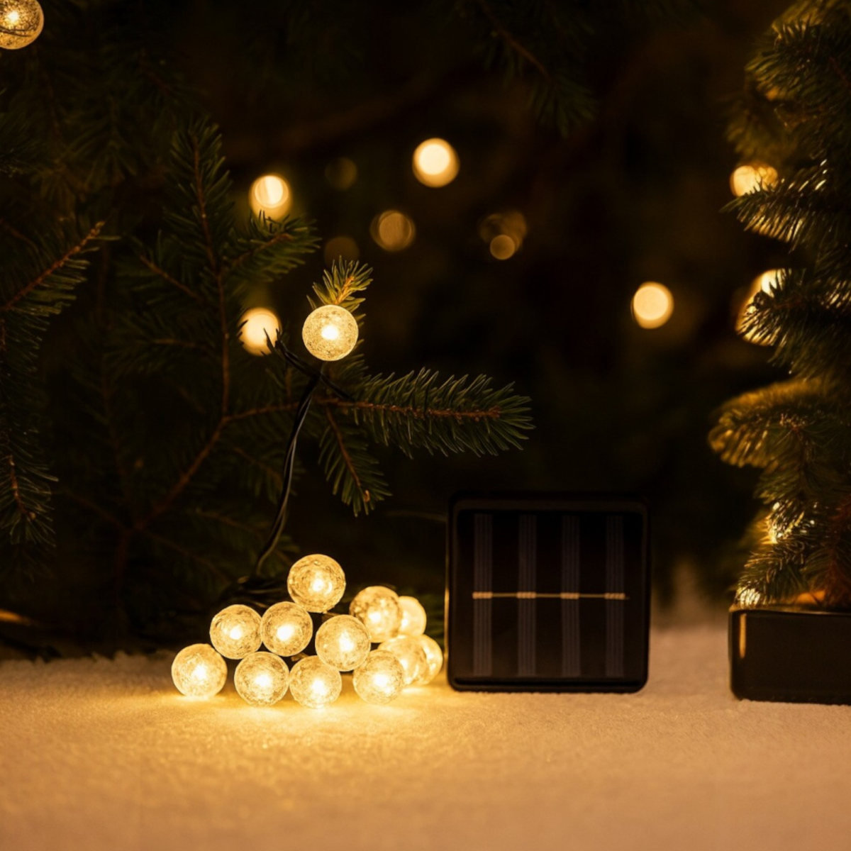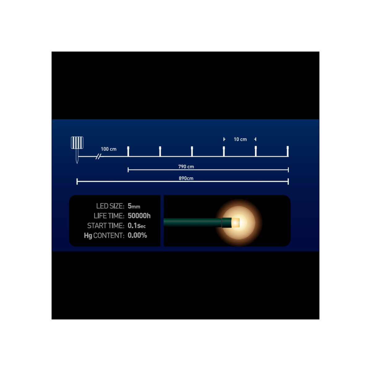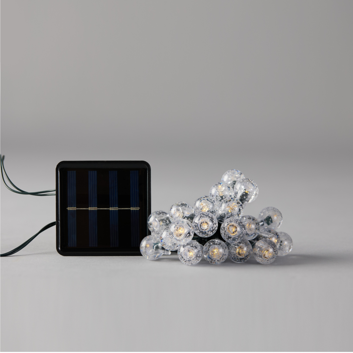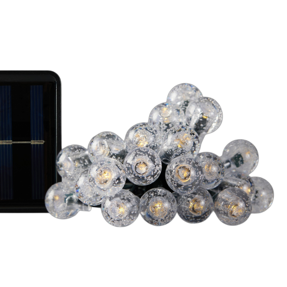 80 db melegfehér LED-del ellátott napelemes fényfüzér. A 100 cm-es betápvezetékhez 790 cm hosszúságú füzér kapcsolódik, amelyen 1,8 cm átmérőjű gömbök adják a fényforrást. A beépített fényérzékelőnek köszönhetően a lámpák automatikusan bekapcsolnak sötétedéskor, majd hajnalban kikapcsolnak. Az IP44 védelem révén kültéren fedett helyen is használható, 8 különböző fényjáték üzemmódot kínálva.