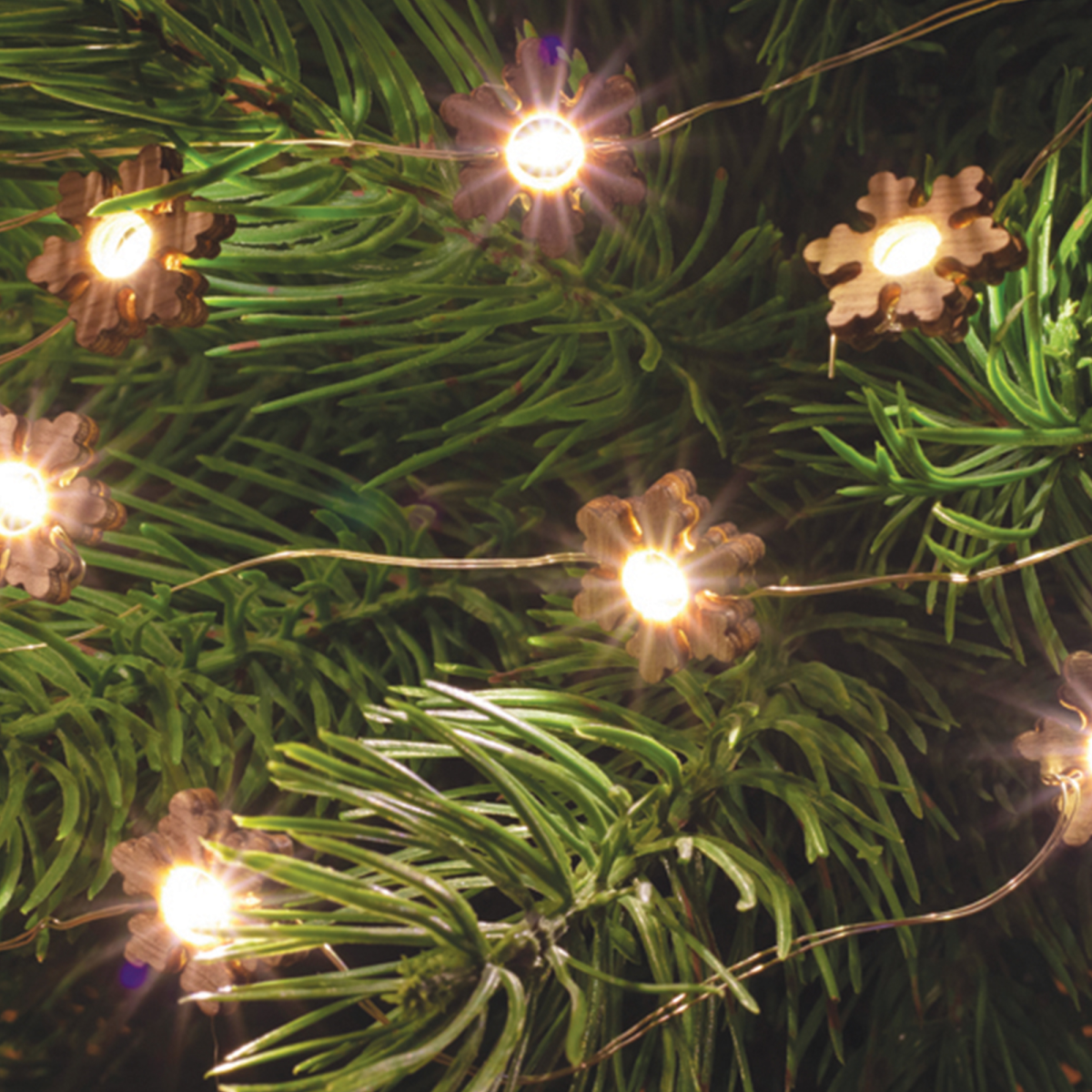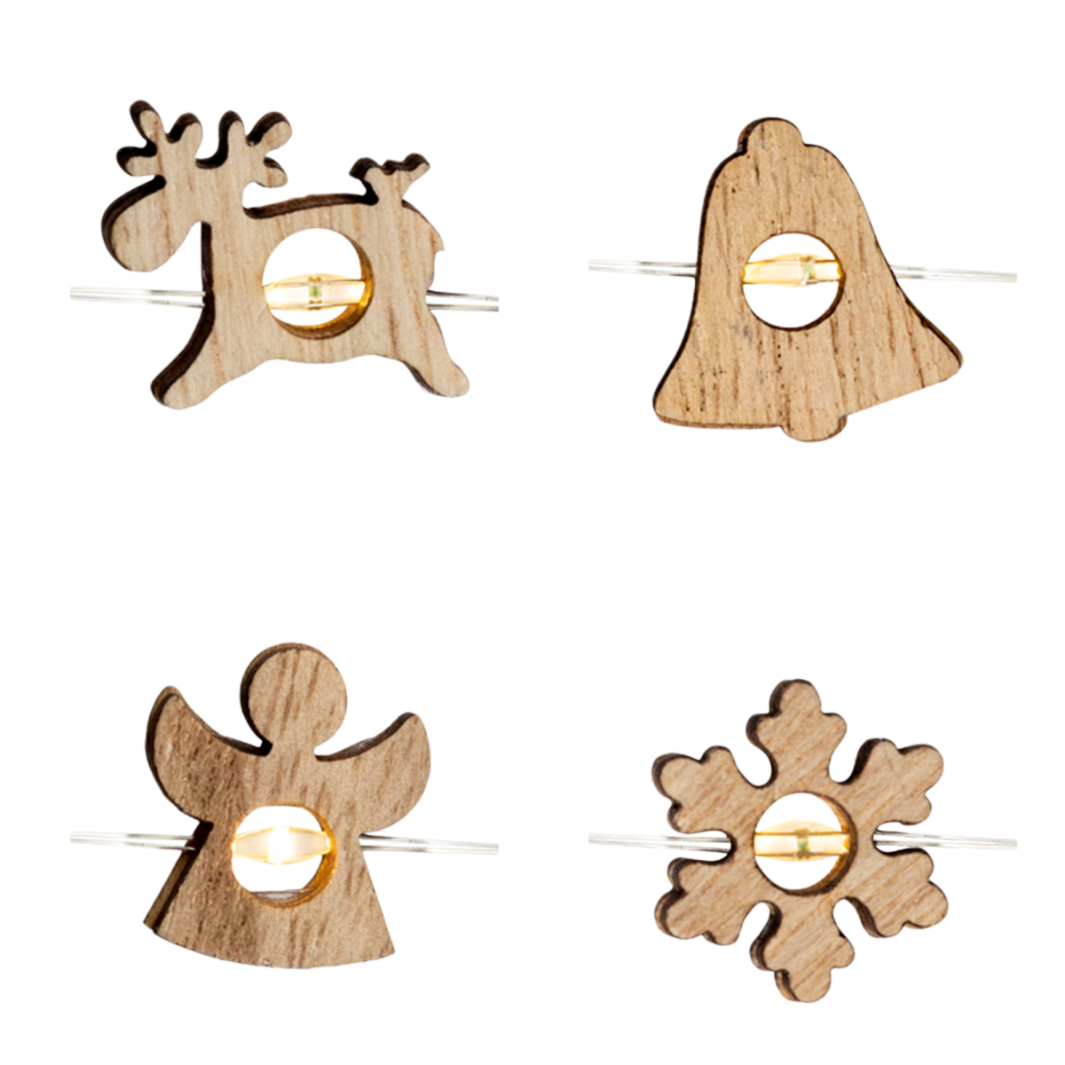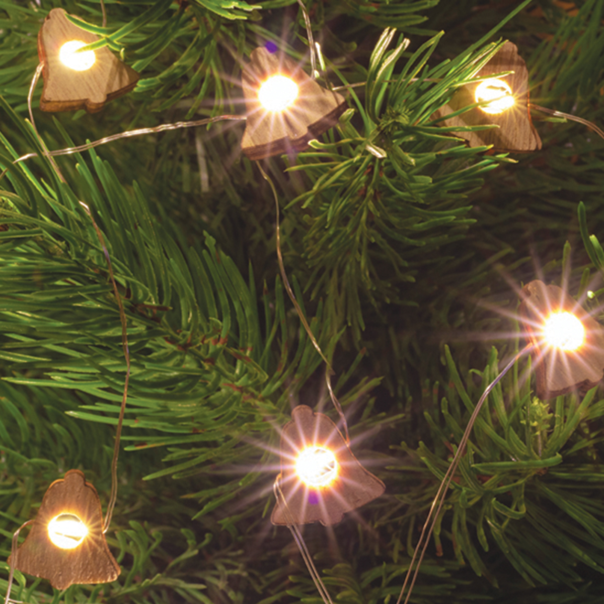 Szeretné egyedivé tenni a belső terét az ünnepek alatt? Ez a figurás fényfüzér a tökéletes választás hozzá! Ez a beltéri kivitelű fényfüzér 20 db meleg fehér micro-LED-del rendelkezik, amelyek mindegyike vékony, átlátszó vezetéken helyezkedik el. Egy fényfüzéren belül a LED-ek vagy rénszarvas, vagy harang, vagy angyal, vagy hópehely figurákkal vannak díszítve, mely díszek fából készültek. A fényfüzér kikapcsolt, bekapcsolt és ismétlődő időzítés funkciókkal is rendelkezik (6 óra bekapcsolt és 18 óra kikapcsolt állapot), ami nagyban leegyszerűsíti a használatát. A tápellátás 2 db 1,5 V (AA) elemmel működik, amelyek nem tartoznak a csomaghoz.