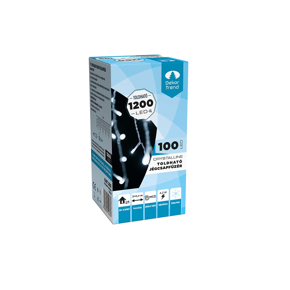 Dekortrend Crystalline toldható jégcsap fényfüzér átlátszó kábellel hideg fehér színben. Meseszép fényfüzér átlátszó kábellel fák, korlátok, mennyezetek és oszlopok dekorálására. A toldható rendszer lehetővé teszi, hogy akár 1200 LED-ig egybe kapcsoljunk több Crystalline terméket. Az egyenes fényfüzér felhasználására csak a fantáziánk szab határt. Az átlátszó kábel alig észrevehető, a LED-ek fényei maximálisan érvényesülnek. Visszafogott tiszta fehér fénye hűvös, elegáns hangulatot teremt. A Dekortrend Crystalline LED fényfüzér család kiválóan alkalmas rendezvények, esküvők, kertek ünnepi vagy alkalmi díszítésére. IP44-es szigetelésének köszönhetően kültéren is használható. A Crystalline kültéri fényfüzér, fényháló, jégcsap fényfüzér és fényfüggöny szabadon egymásba toldható. A tápegység nem része a csomagnak, azt külön kell megvásárolni. Keresd a KAT 900 cikkszámú terméket. 1200 LED-enként szükséges egy trafó beépítése.