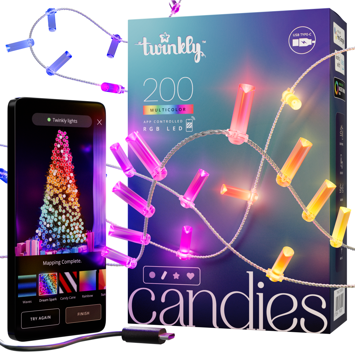A gyertya alakú, intelligens dekorációs lámpák rendkívüli fényerővel, a telefonról leképezhető, testreszabható effektekkel és könnyű, hordozható kialakítással varázsolják el otthona bármely lakóterét. Akár hangulatos fényt szeretne varázsolni gyermeke szobájába, akár igéző streaming-összeállításokat szeretne készíteni, akár az ünnepi ünnepségeket szeretné feldobni, akár személyre szabottan szeretné feldobni a belső teret. 200 LED-ből áll, a gyertyák 7mm-esek. RGB, átlátszó fényfüzéren 6cm-es távolságban helyezkednek el az égők, teljes hossza 12 méter. Egyszerűen állítható a Bluetooth és Wifi kapcsolatnak köszönhetően. IP20-es besorolású, USB-C-s tápellátású.