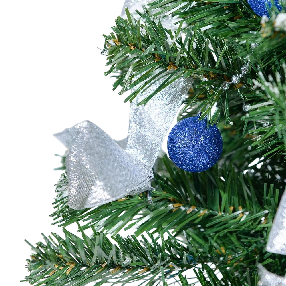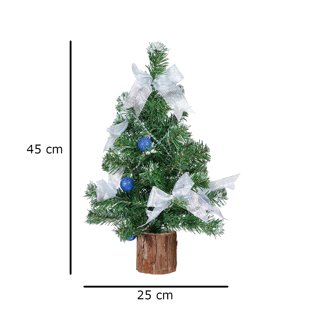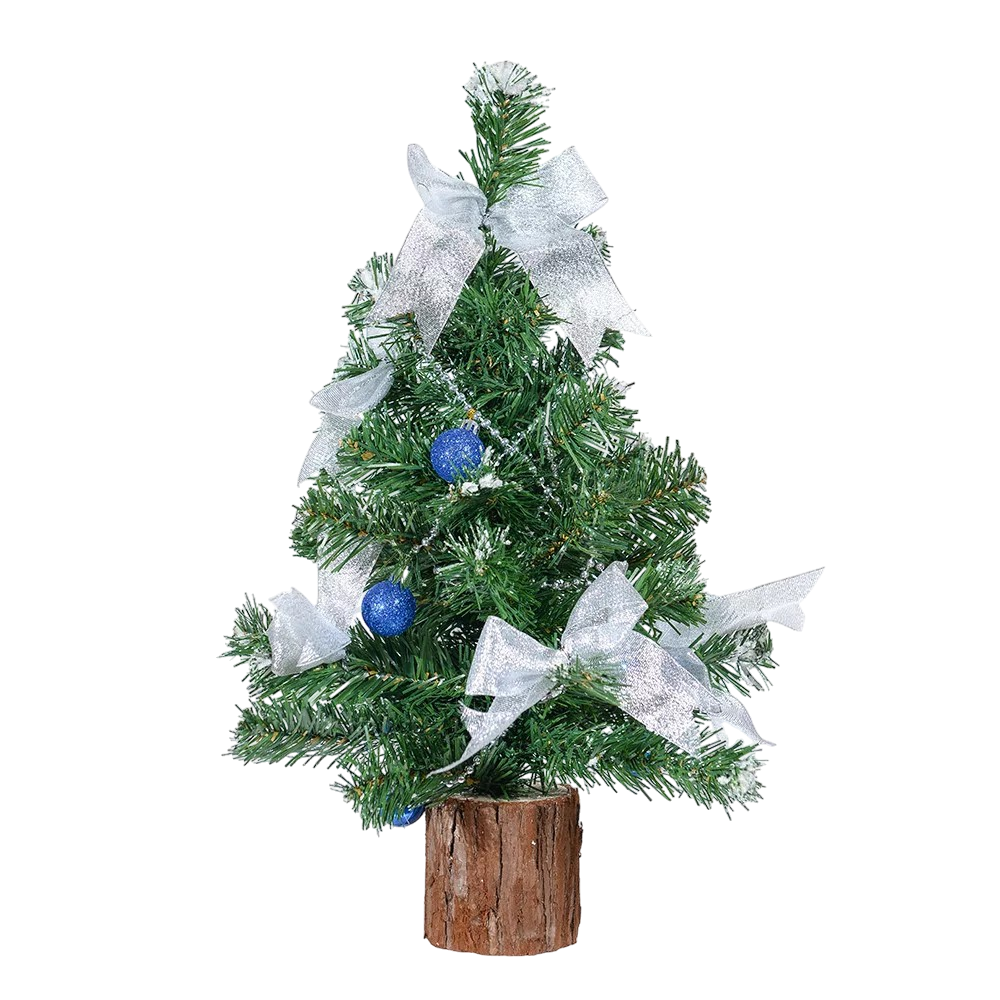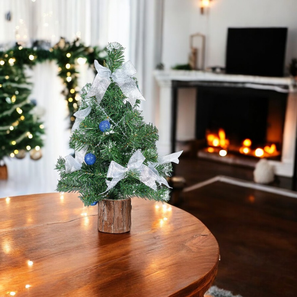 Dekoratív asztali műfenyő talppal és díszítéssel, Mérete: 45 cm. Pántos ágkonstrukcióval. Ágak száma: 40, 2D levelek.