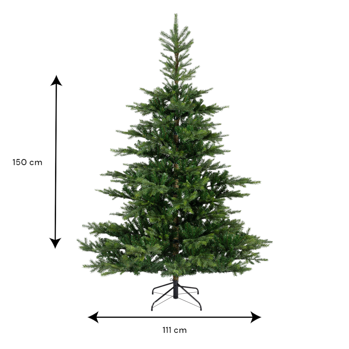 A 'Grandis fir' műfenyő 150 cm-es magasságával ideális választás kisebb terekbe, ahol mégis fontos a természetes hatású, látványos karácsonyfa. Az ágak sűrű elrendezése és különböző hosszúságú tűlevelei élethű megjelenést biztosítanak, a zöld színárnyalatok pedig a valódi fenyő hatását keltik. Fém talpa stabil alapot nyújt az ünnepi időszak alatt.