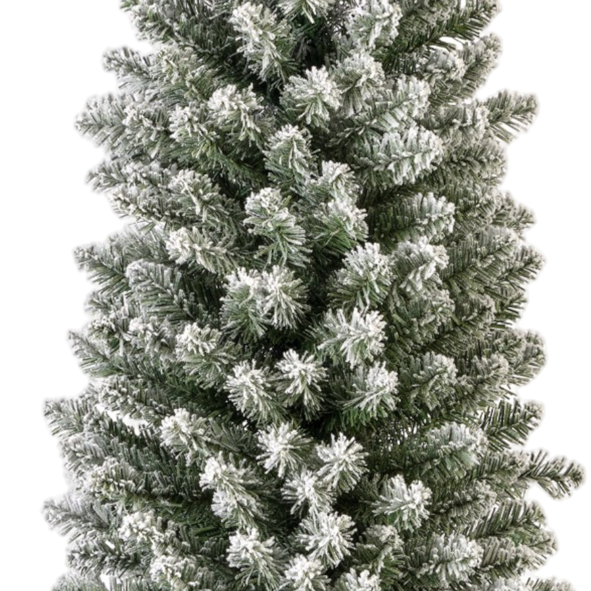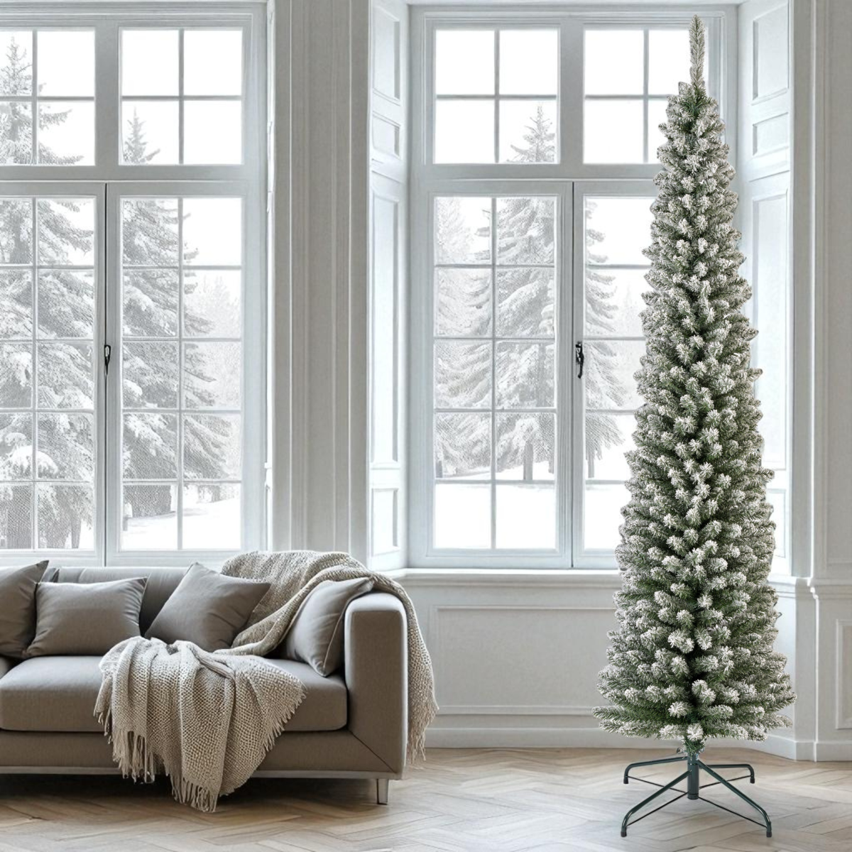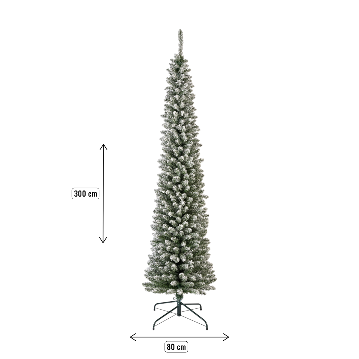 Ez a 300 cm magas, karcsú kialakítású műfenyő ideális választás, ha igazán látványos karácsonyfát szeretnél otthonodba vagy nagyobb beltéri térbe. A dús, zöld tűlevelek végén fehér, havas hatású bevonat gondoskodik a téli hangulatról. Stabil fém talppal és könnyen összeilleszthető ágakkal érkezik, így a fa egyszerűen felállítható és díszíthető.