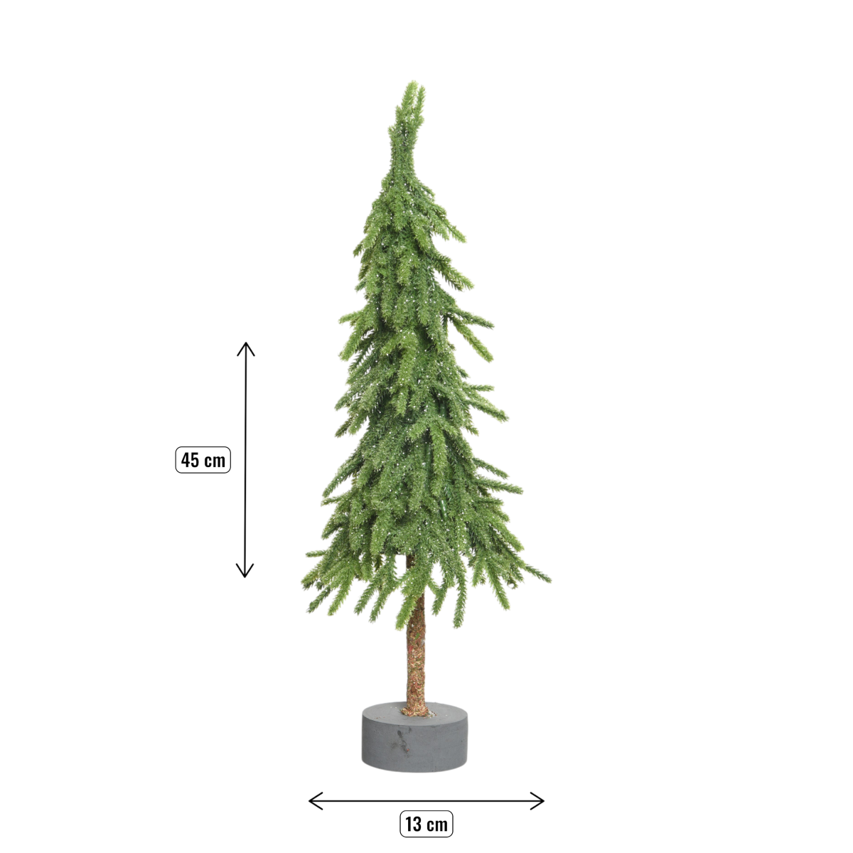 Ez a 45 cm magas, zöld színű mini műfenyő ideális választás, ha szeretnél ünnepi hangulatot varázsolni kisebb terekbe is. A természetes hatású fenyőágak élethű megjelenést biztosítanak, míg a stabil talp gondoskodik a biztonságos elhelyezésről. Tökéletes dekoráció polcra, asztalra vagy akár irodai környezetbe.