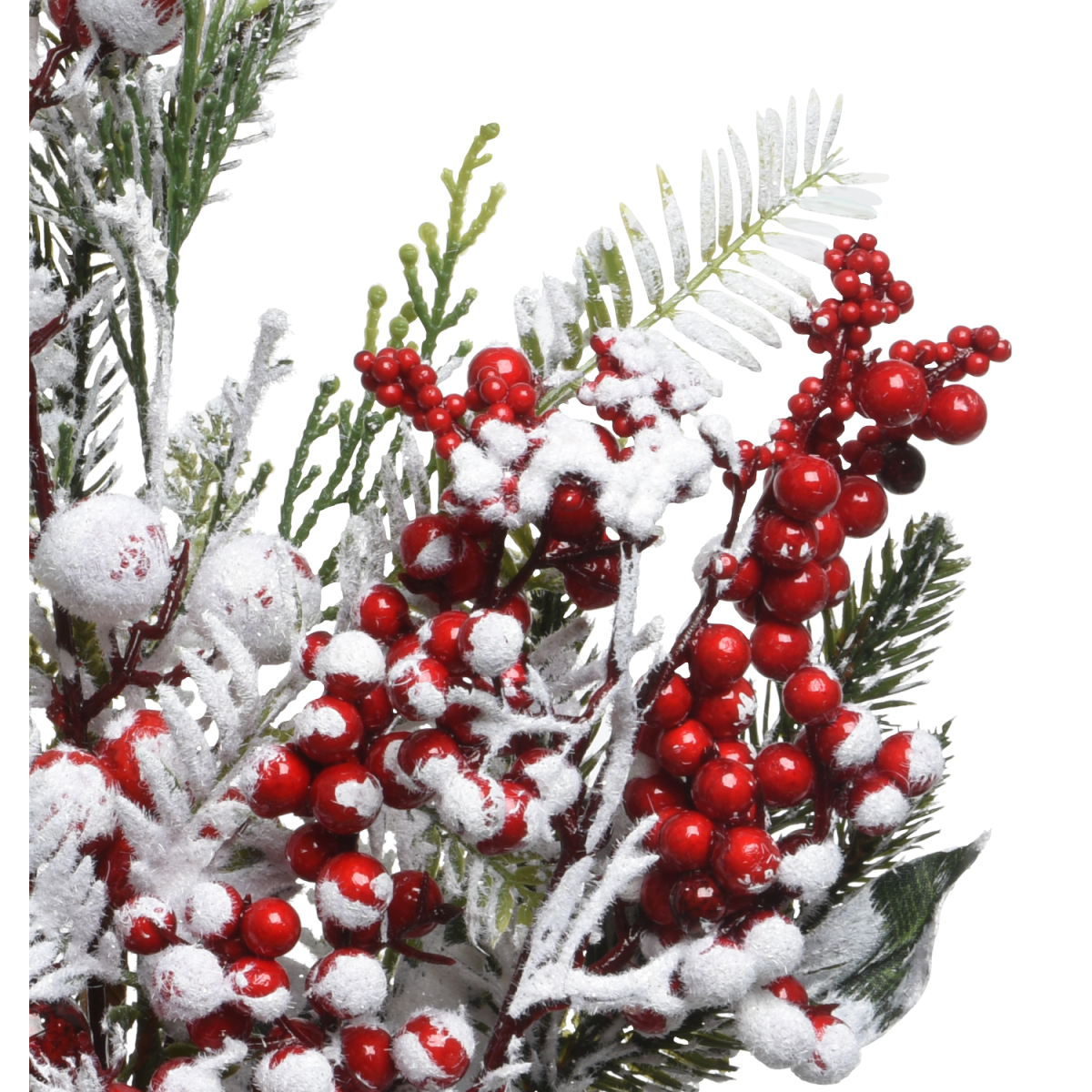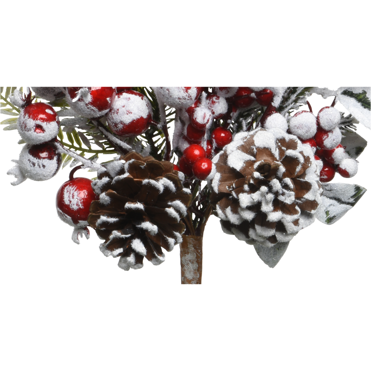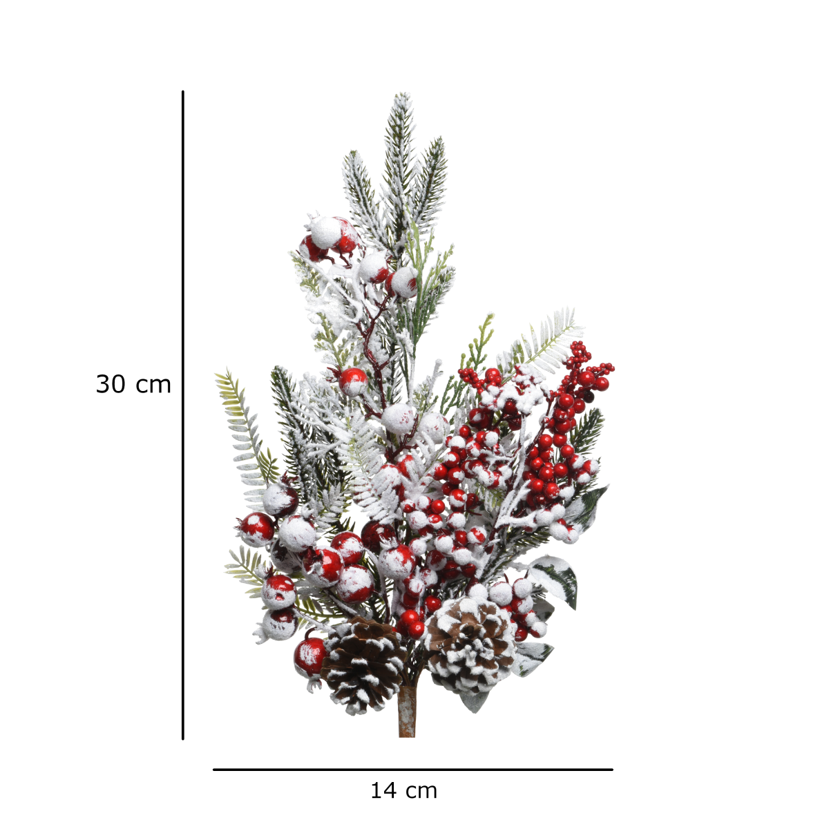 Ez a 30 cm magas műfenyő ág műhóval borított, ami igazi havas hangulatot áraszt, így tökéletes kiegészítője lehet a téli és karácsonyi dekorációnak. A bogyók és tobozok további részletgazdagságot adnak az ágnak, ami még inkább fokozza a karácsonyi varázst. Ideális választás lehet vázába állítva asztaldísznek, de ajándékcsomagok extra dekorálására is nagyszerű.