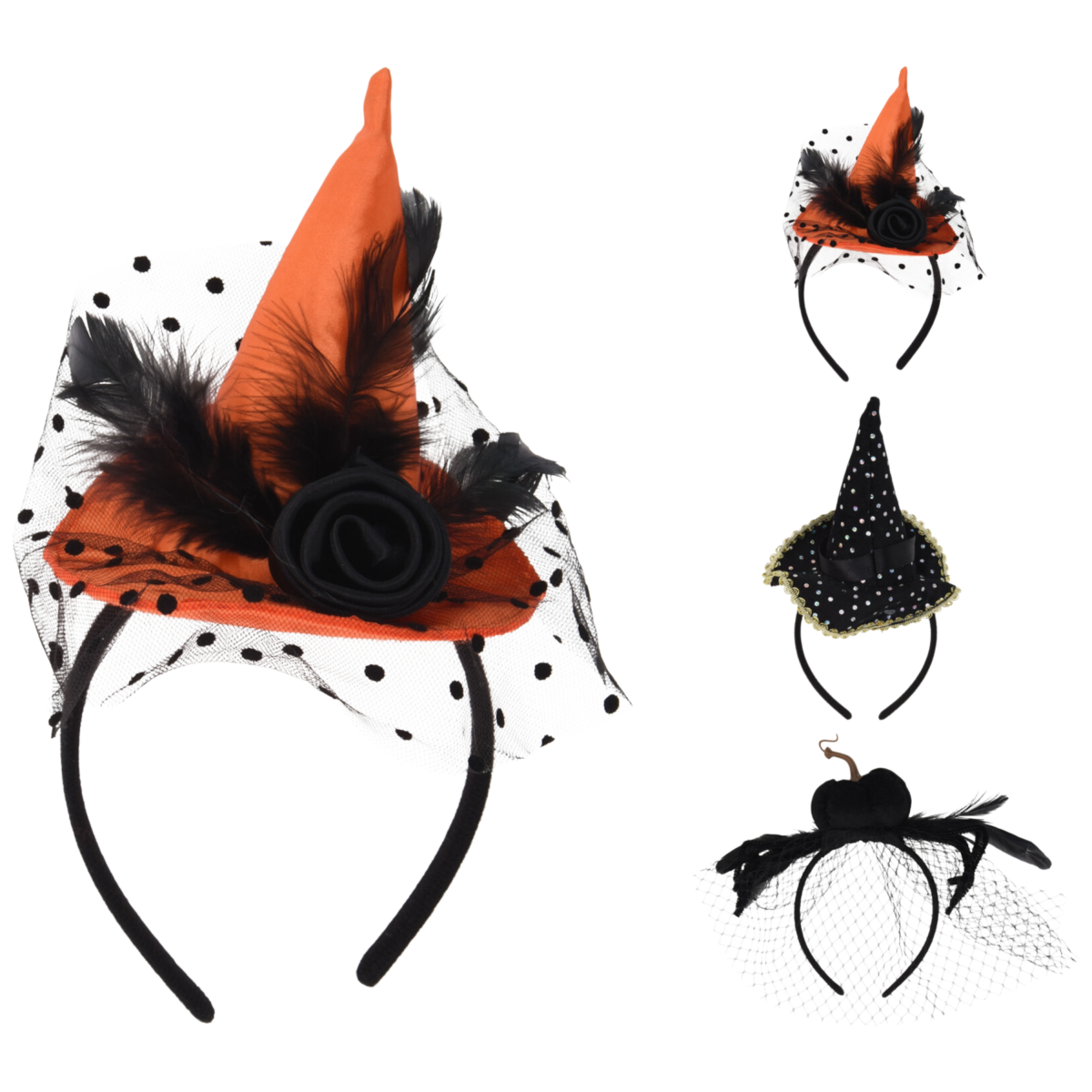 Ez a mini kalapos fejpánt garantáltan vidám és stílusos kiegészítője lesz bármelyik Halloween jelmeznek. A 3-féle mintában elérhető fejdísz könnyű poliészter anyagból készült, így kényelmes viseletet biztosít. A boszorkányos motívumokat dísztüll, csipke, toll és virág teszi még hangulatosabbá.